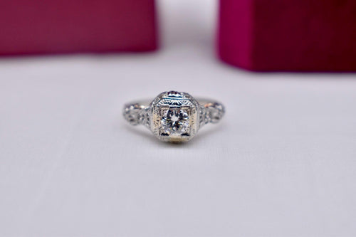 Vintage 18K White Gold Art Deco Floral Diamond Engagement Ring