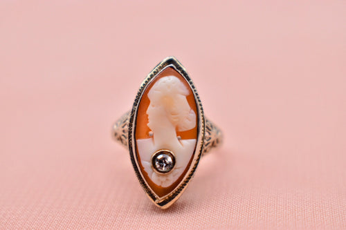 Vintage 14K White Gold Art Deco Filagree Shell Cameo & Diamond Ring