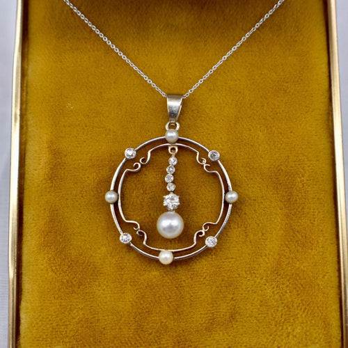 14K Yellow Gold & Platinum Edwardian Pearl and Old Mine Cut Diamond Lavalier Necklace