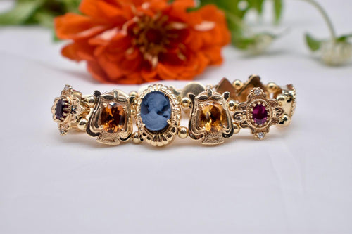 14K Yellow Gold Avant Garde Richard Glatter Multi Gemstone Completed Slide Charm Bracelet