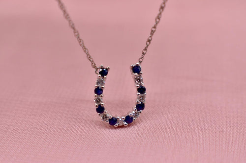 14K White Gold Vintage Horse Shoe Sapphire and Diamond Necklace