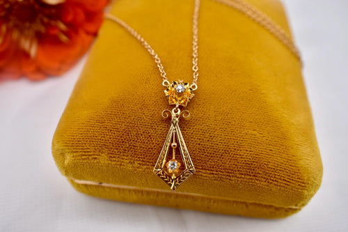 14K Yellow Gold Victorian Revival Two Stone Diamond Lavalier Floral Necklace