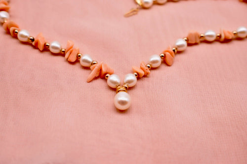 14K Yellow Gold Vintage White Pearl & Coral Bead "Y" Necklace