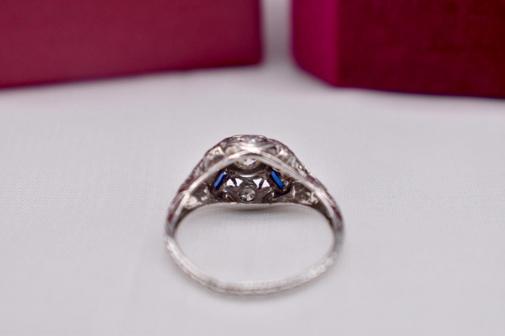 One beautiful vintage platinum Art Deco unique sapphire accented Old European cut diamond engagement ring from the 1920s. The ring is in excellent antique condition. It is set with one primary old European cut diamond center stone weighing approximately 0.25cts featuring a color of K and a clarity of VS1. The ring is also set with four single cut round accent diamonds weighing approximately 0.08cts total weight featuring a color of G-H and a clarity of VS1-VS2. It is also set with four dark blue baguette shape high quality lab grown sapphire side stones measuring 2.5mmX1mm each. The ring weighs 2.90 grams and is a finger size 6. The shank of the ring is 2.50mm wide at the shoulders and 1.50mm wide at the base. The max width on the face of the ring is 9.86mm. Appraisal Value: $3000. This ring will be shipped in a suede hand made vintage inspired ring box. These can be purchased separately from my store as well in an array of colors. This information is all 100% accurate and being sold by a GIA graduate gemologist. The ring can be sized or personalized with extra handling time and an extra fee. Please specify in notes at checkout if desired.