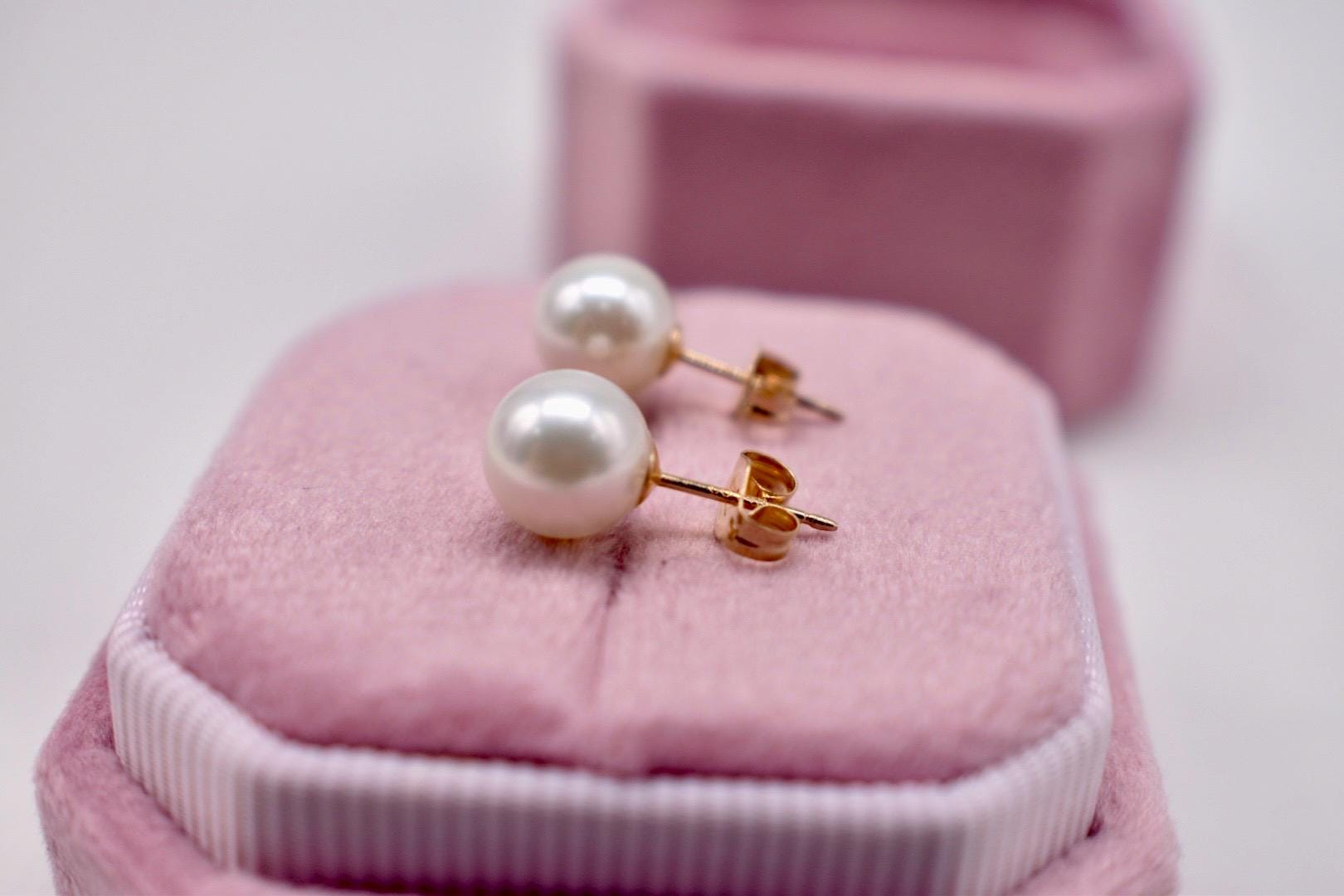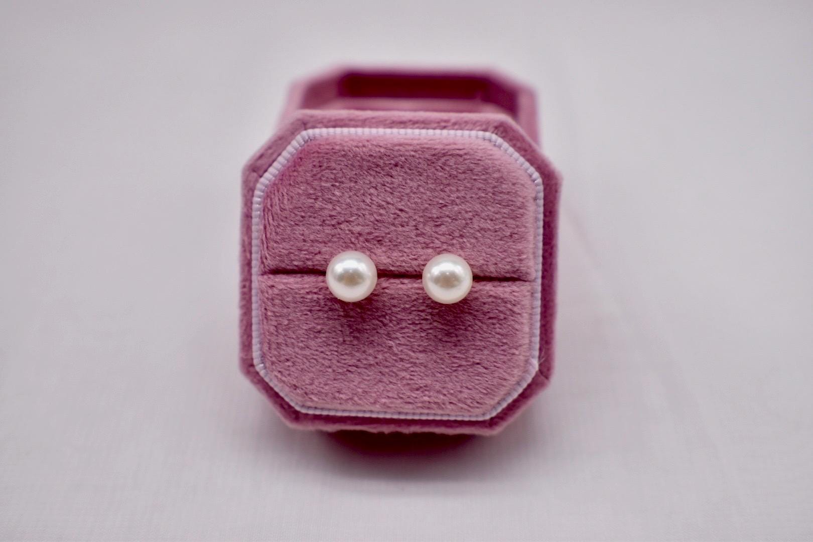 One pair of 14K Yellow gold akoya pearl stud earrings. The earrings are in brand new never worn condition. They are set with two round natural saltwater AAA quality pearls measuring 7mm wide featuring a white color with high luster. They have a pushback style post. Appraisal Value: $500. These earrings will be shipped in a vintage suede hand made box. This information is all 100% accurate and being sold by a GIA graduate gemologist.