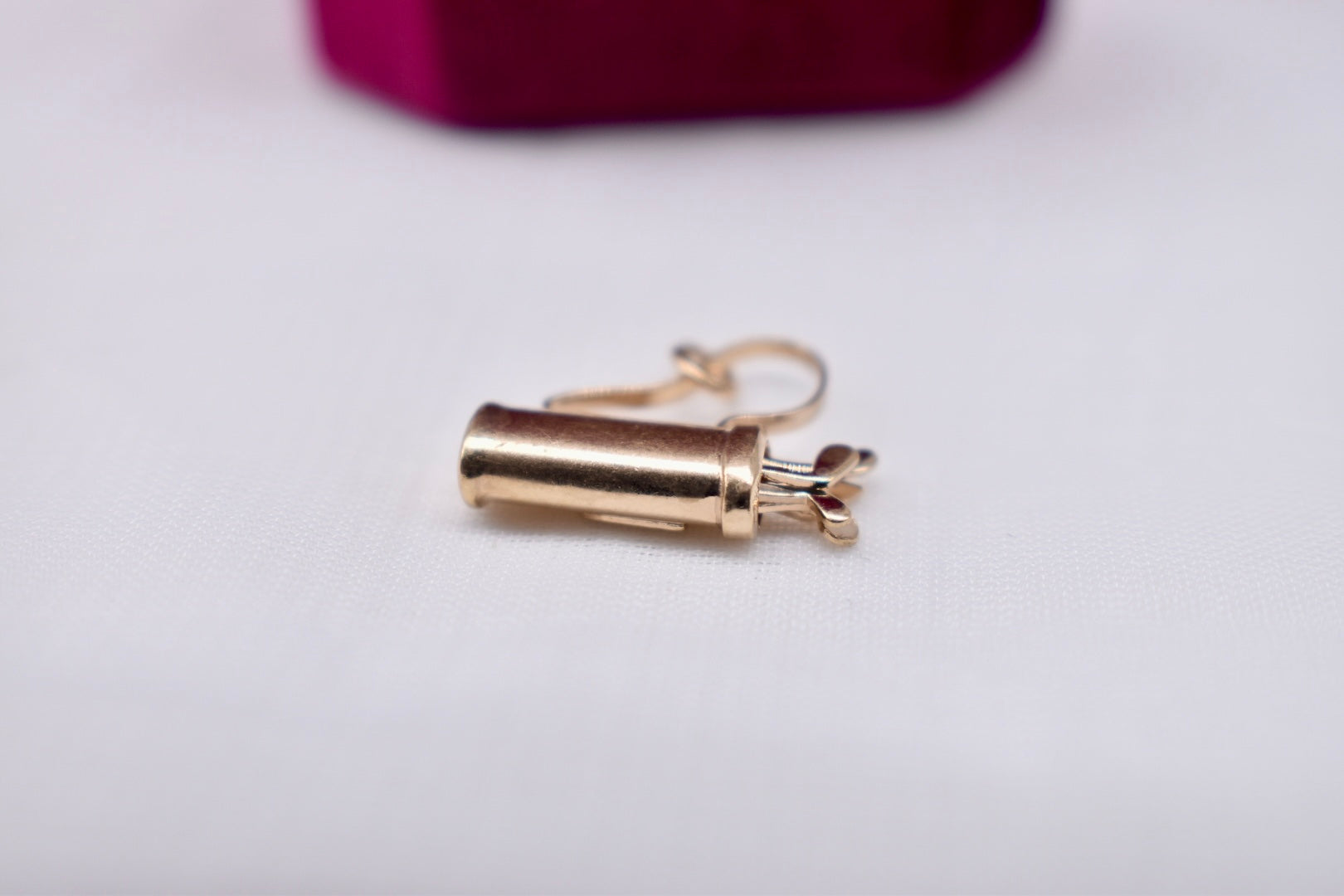 One unique vintage 14 karat solid yellow gold animated golf bag charm. It is in great vintage pre loved condition with some very minor light surface wear throughout. The charm features a super unique design with golf clubs that are slightly moveable in the bag. The charm measures 17.75mmx16.60mm and weighs 1.4 grams. Appraisal Value: $500