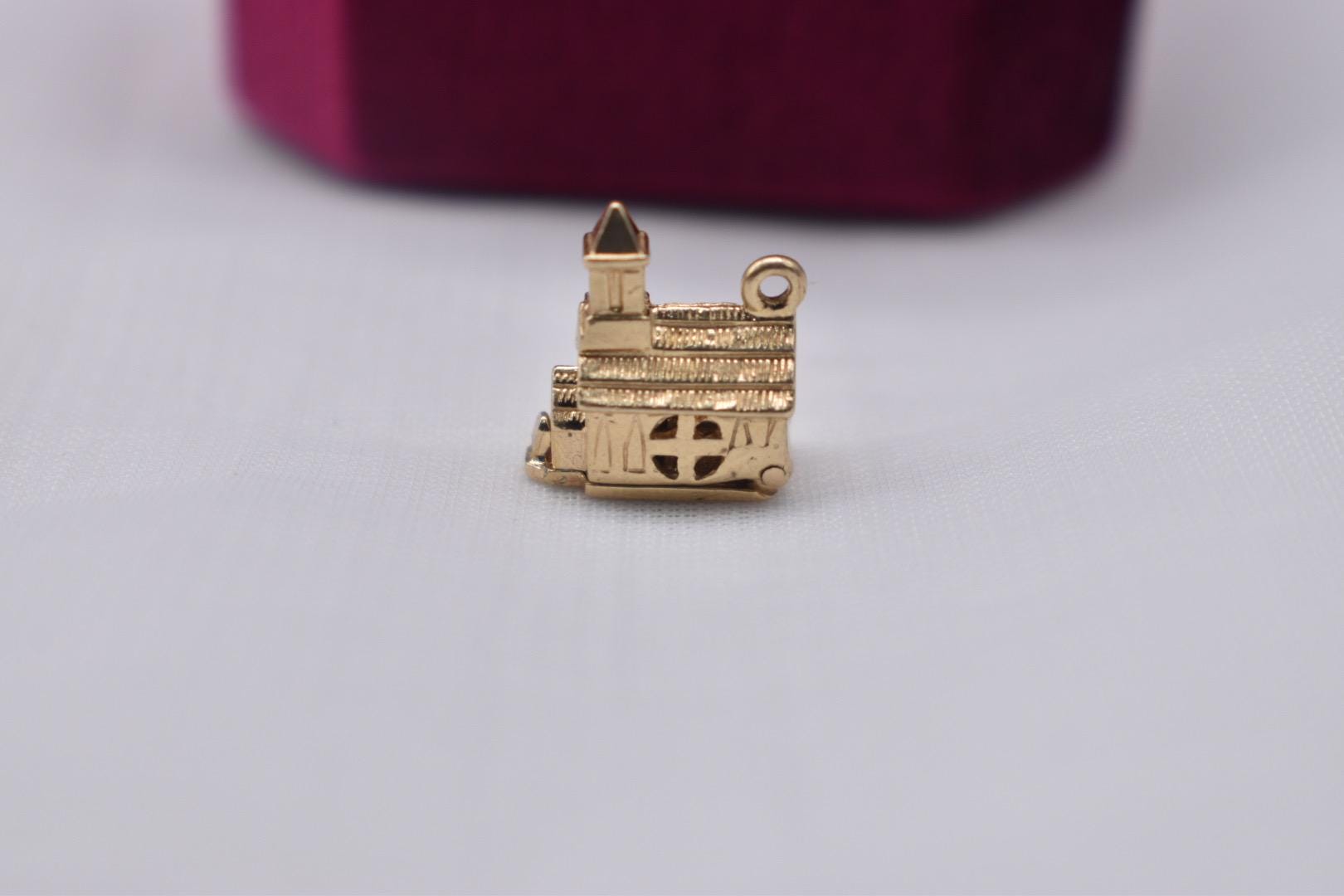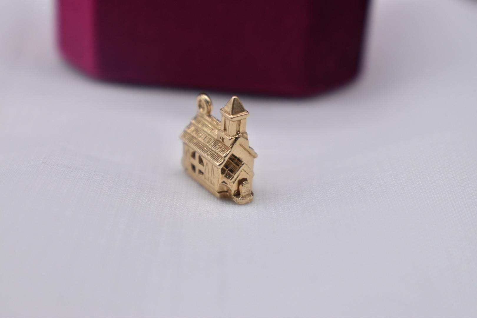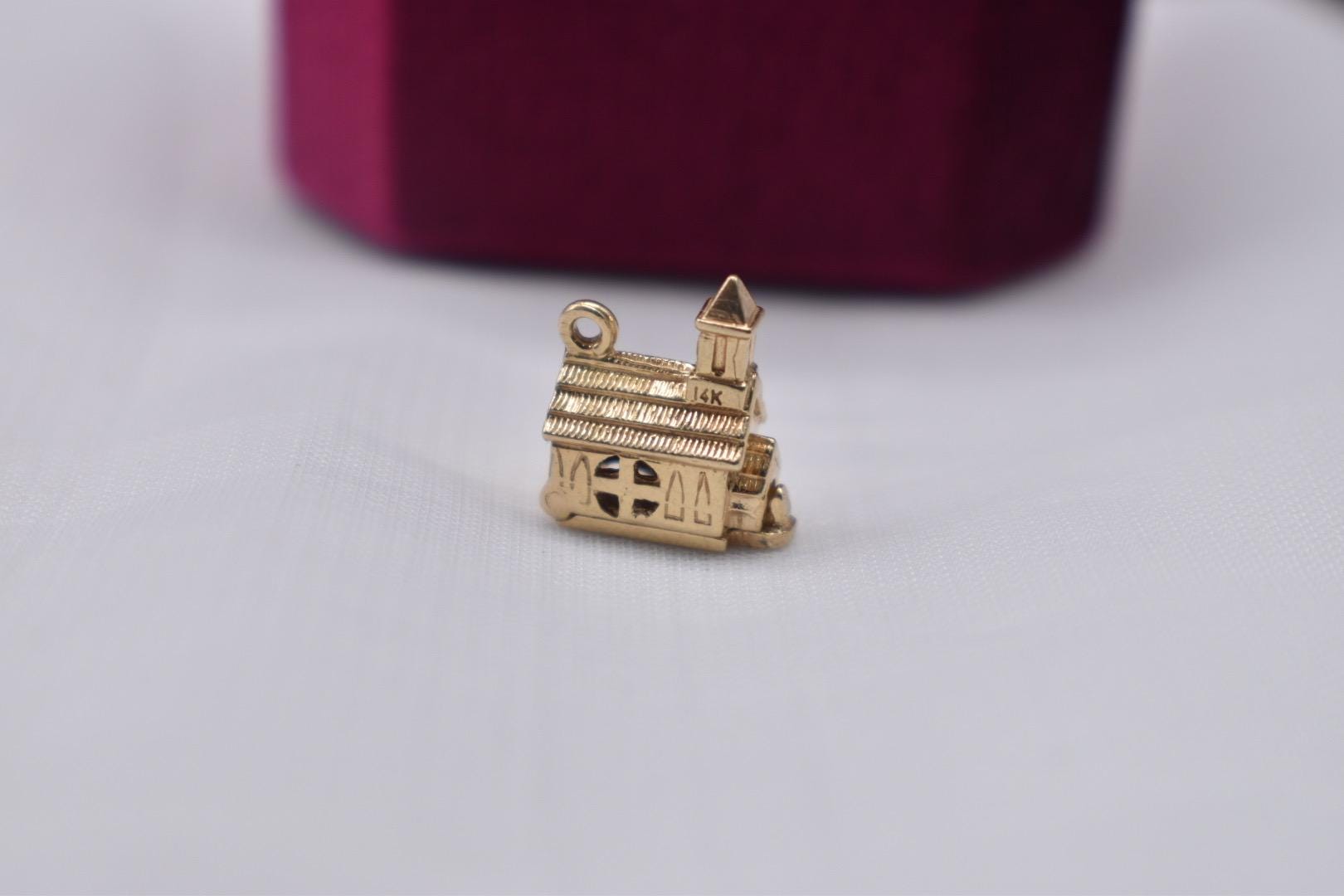 One 14k yellow gold rare vintage wedding chapel pendant or charm. The charm is in good antique condition with light wear with a animated mechanical outer door that opens displaying bride and groom inside (See photos for analysis of detail). The charm measures 12.94mm tall and 5.51mm wide and 11.44mm long not including the jump ring and weighs 2.7 grams. Appraisal value is $800. All information is 100% accurate from a GIA graduate.