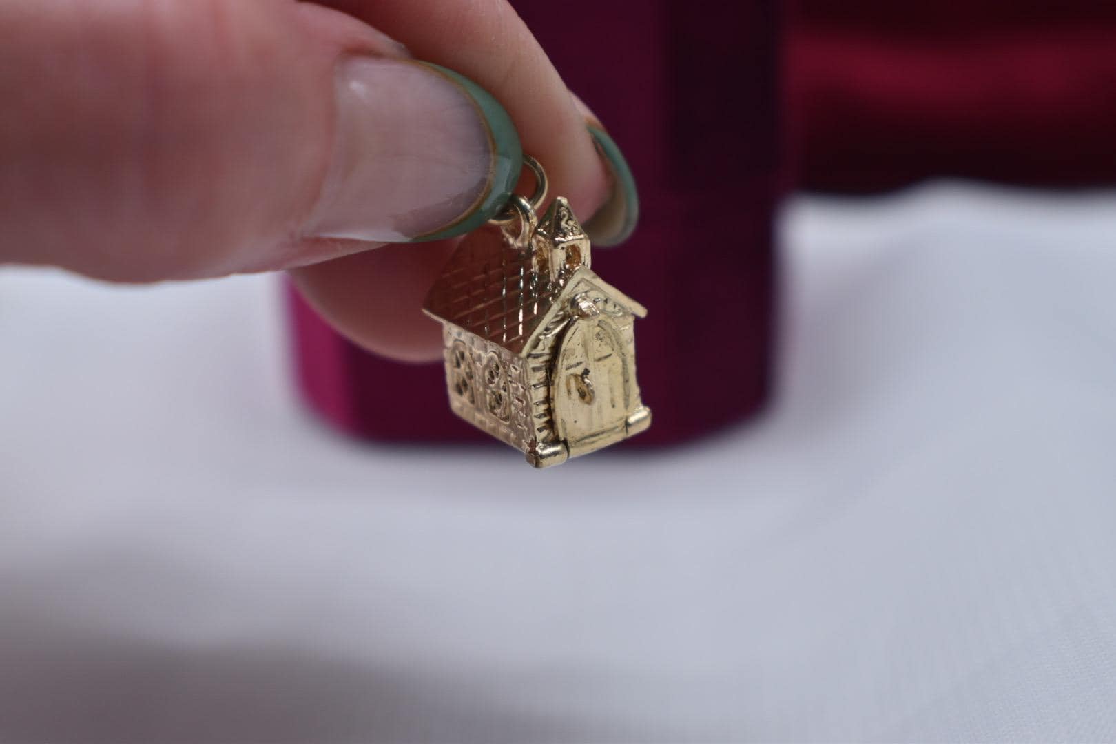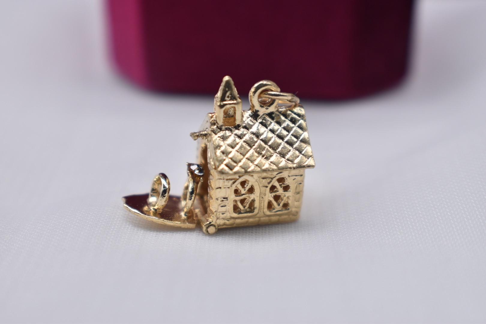 One 14k yellow gold rare vintage wedding chapel pendant or charm. The charm is in good antique condition with light wear with a animated mechanical outer door that opens displaying two rings inside (See photos for analysis of detail). The engagement ring on the inside of the charm is set with one small round CZ rhinestone. The charm measures 16.86mm tall and 12.2mm wide not including the jump ring and weighs 5.3 grams. Appraisal value is $1400. All information is 100% accurate from a GIA graduate.
