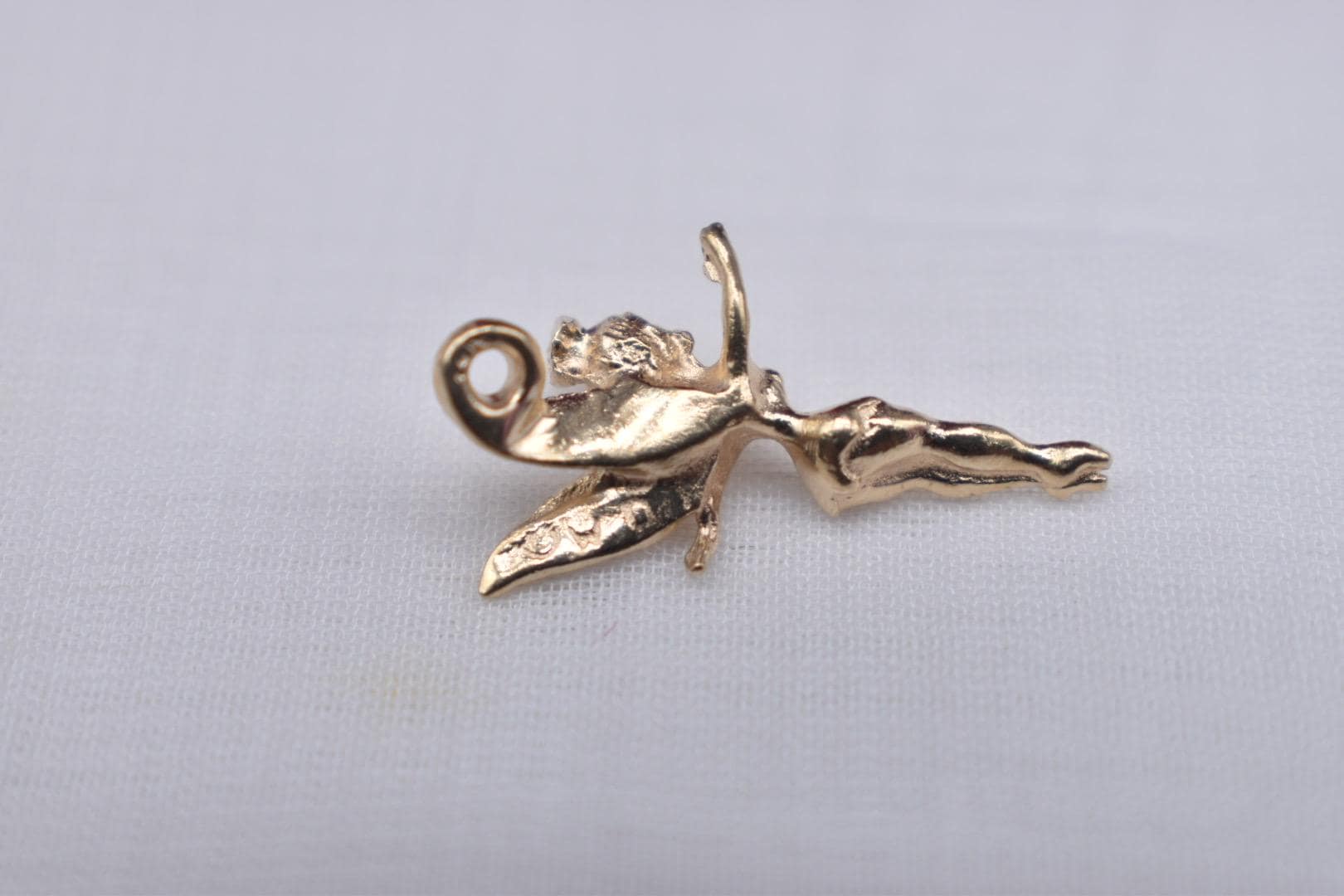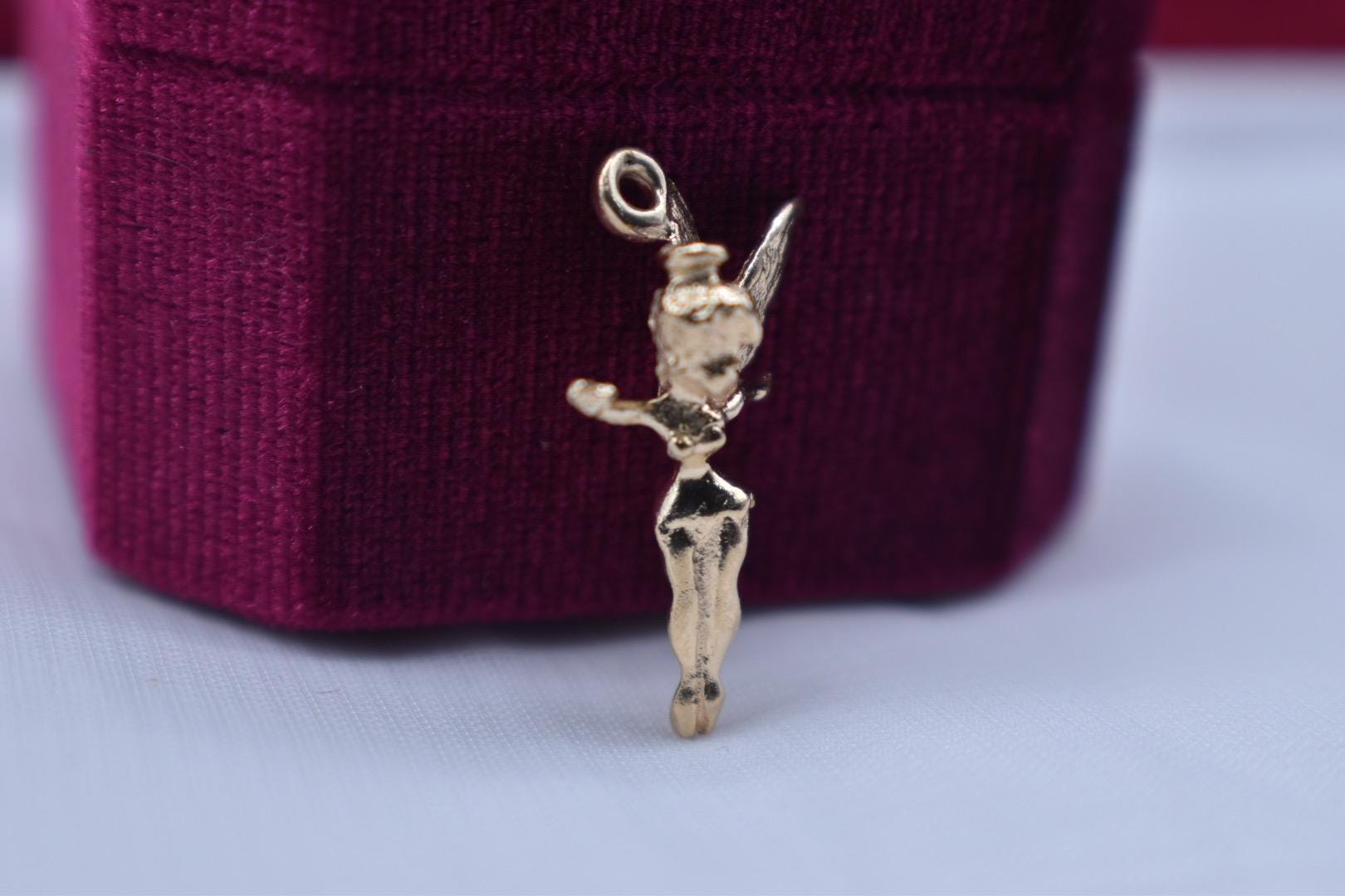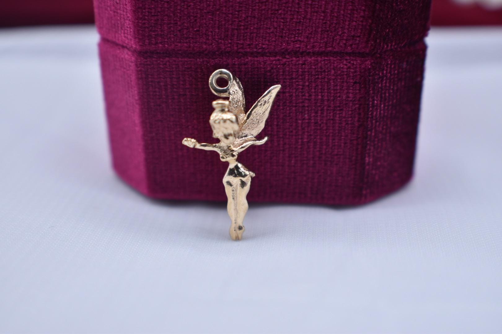 One authentic Walt Disney 14k yellow gold vintage Tinker Bell charm. The charm is in very good condition with little noticeable wear. The adorable Tinker Bell charm is 24.45mm tall and 16mm wide. The charm weighs 2.0 grams and is all solid 14 karat. Please inquire if you would like a chain or charm bracelet to go with it, I have them available! Appraisal value is $1000. All information is 100% accurate from a GIA graduate.