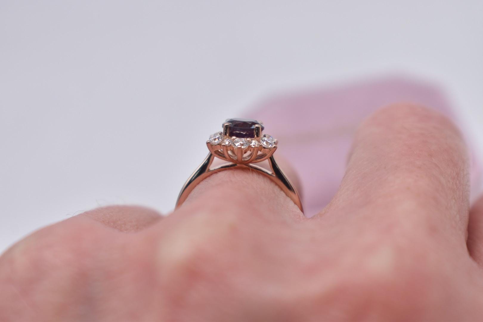 One 14k rose gold halo style lab grown alexandrite and moissanite ring. The ring is in outstanding condition very lightly worn with a unique vintage halo design. The ring is set with one primary round lab grown color changing alexandrite weighing approximately 1.20cts. It is also set with twelve modern brilliant cut round moissanites in the halo weighing approximately 0.30cts total weight featuring a color of DEF and a clarity of VVS1. The ring is a finger size 5 and weighs 2.7 grams. The shank measures 1.72mm at the shoulders and 1.81mm at the base. The top face of the ring measures 11.37mm. Appraisal Value: $1800. This ring will be shipped in a vintage suede hand made ring box. These can be purchased separately from my store as well in an array of colors. This information is all 100% accurate and being sold by a GIA graduate gemologist. The ring can be sized or personalized with extra handling time and an extra fee. Please specify in notes at checkout if desired.