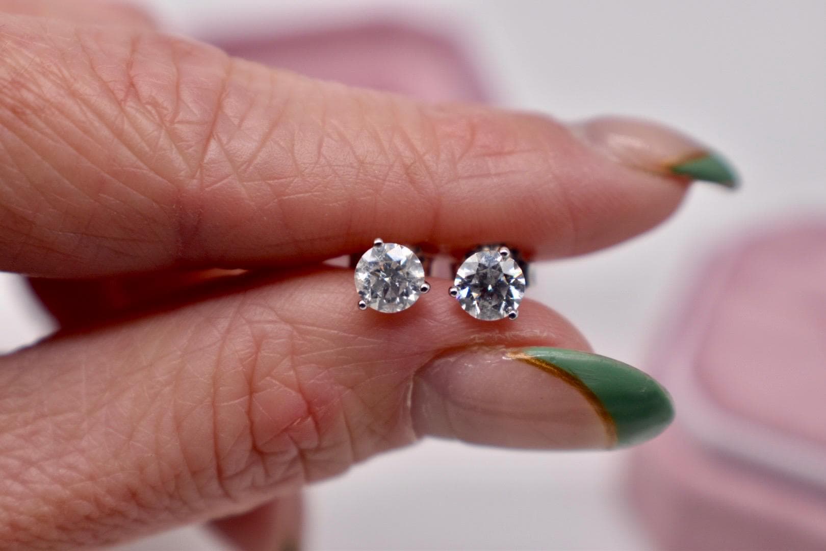 One pair of 14K white gold round cut diamond push back martini set earrings. The earrings are set with two round matching modern cut diamonds weighing approximately 0.94cts total weight featuring a color of F-G and a clarity of I1-I2. The diamonds are set in 14K white gold three prong martini style mountings with a push back style post. The earrings weigh 0.80 grams. The diamonds have been graded by a GIA diamond graduate and all information is 100% accurate. Earrings will come with a written insurance appraisal. Appraisal value: $2500.