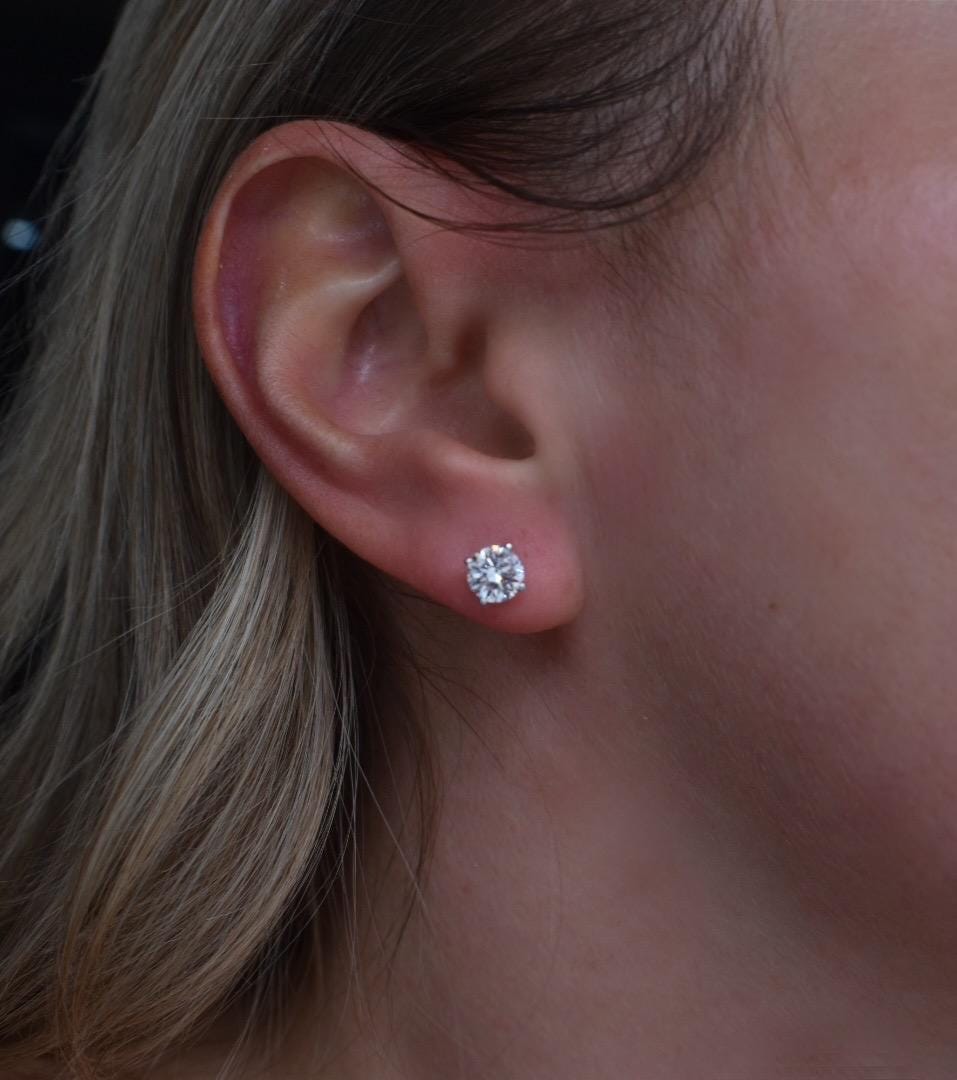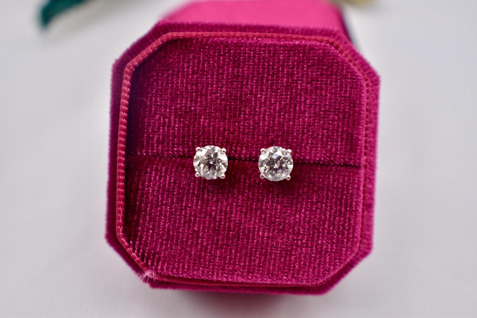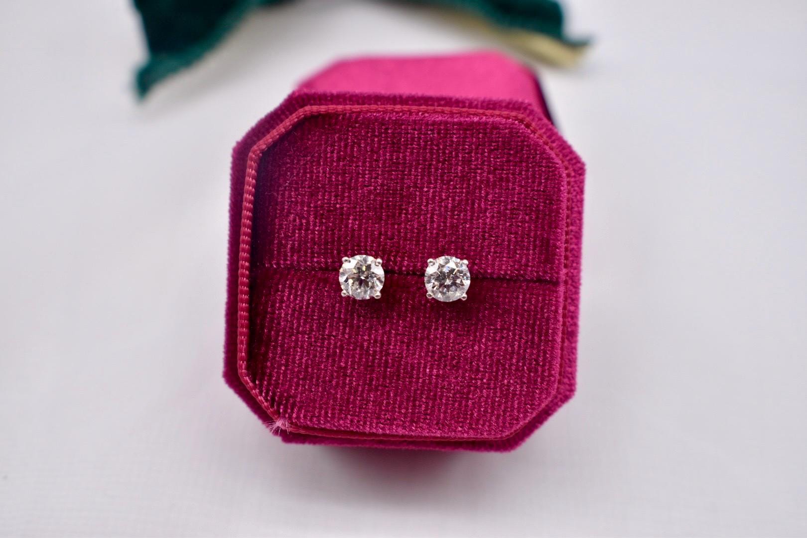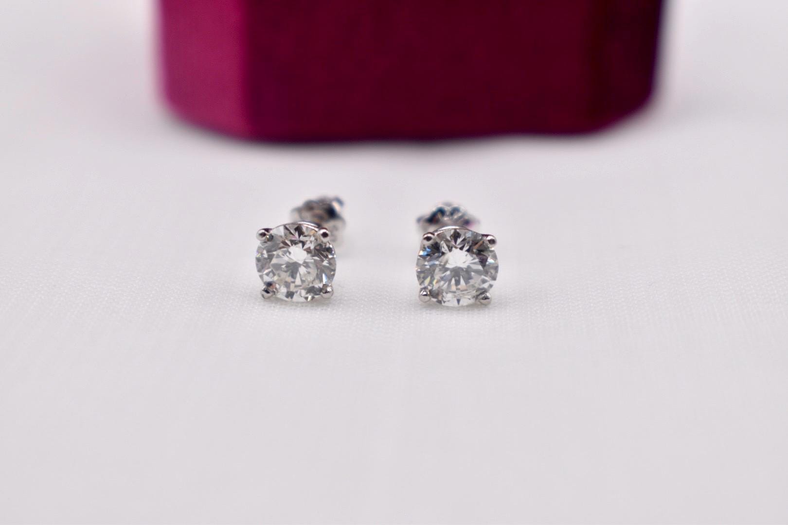 One pair of beautiful 14K white gold round cut natural diamond screw back earrings. The earrings are set with two round modern cut earth mined natural diamonds weighing approximately 1.50cts total weight featuring a color of I and a clarity of I1. The diamonds are set in 14K white gold four prong style mountings with a screw back style post. The diamonds have been graded by a GIA diamond graduate and all information is 100% accurate. Earrings will come with a written insurance appraisal. Appraisal value: $5000.