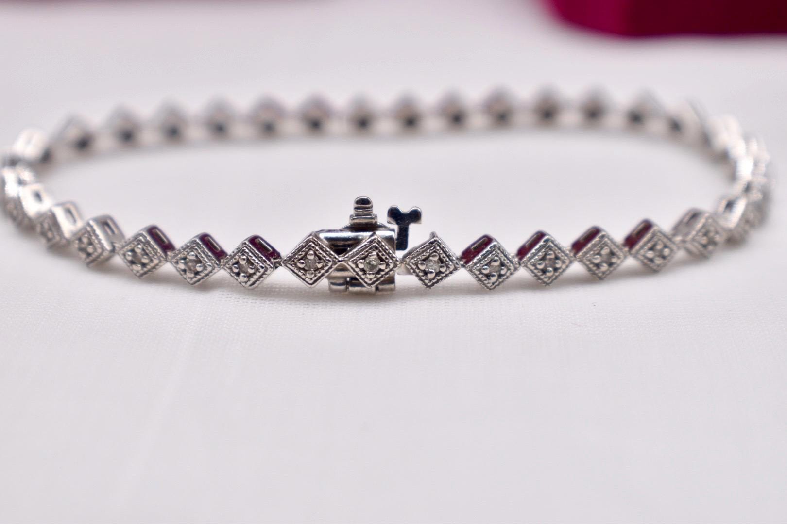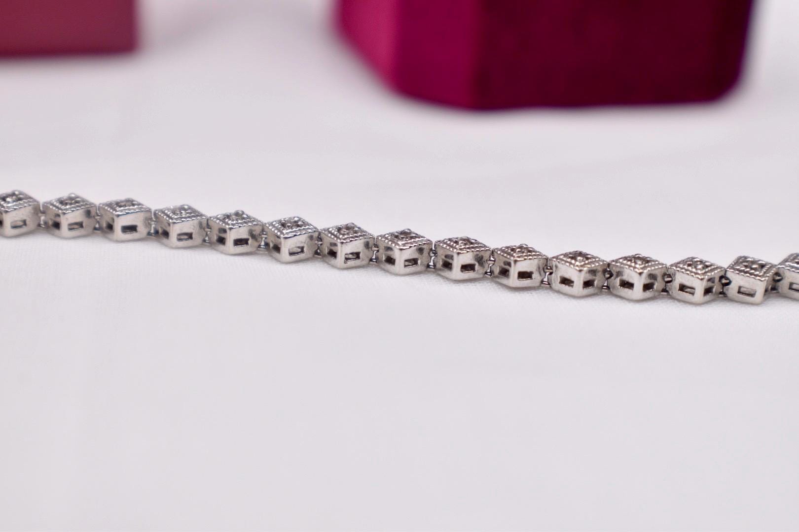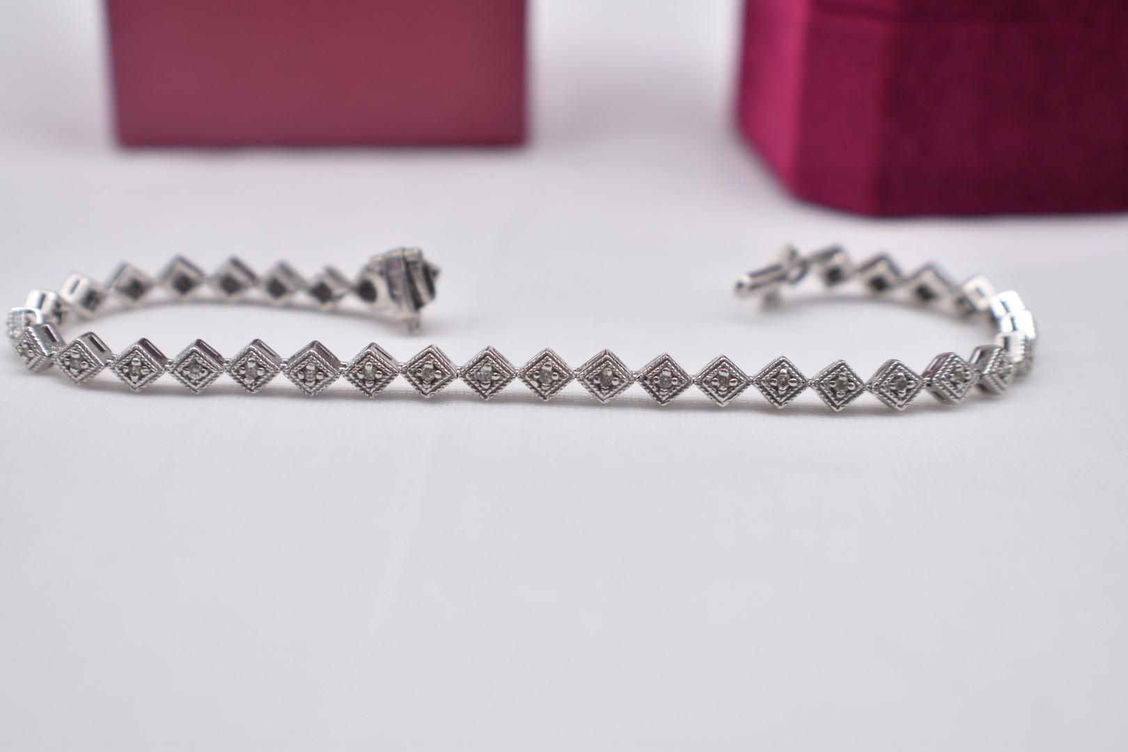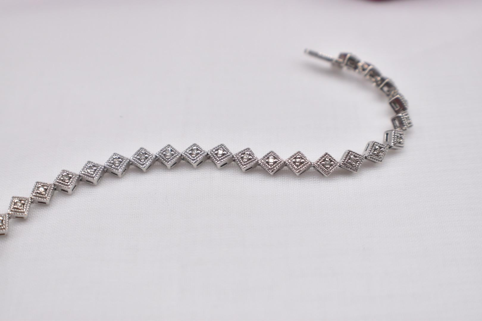 One 14 karat white gold vintage unique style diamond bracelet. The bracelet is in excellent condition with little to no visible wear and a unique diamond shaped geometric link design. It is set with thirty-six matching modern cut diamonds weighing approximately 0.54cts total weight with a color of I-J and a clarity of I1-I2. The bracelet weighs 11.8grams and is 7 inches in length. It has a tongue style clasp with a safety catch that work like new. Appraisal Value: $4000. This information is all 100% accurate and being sold by a GIA graduate gemologist.