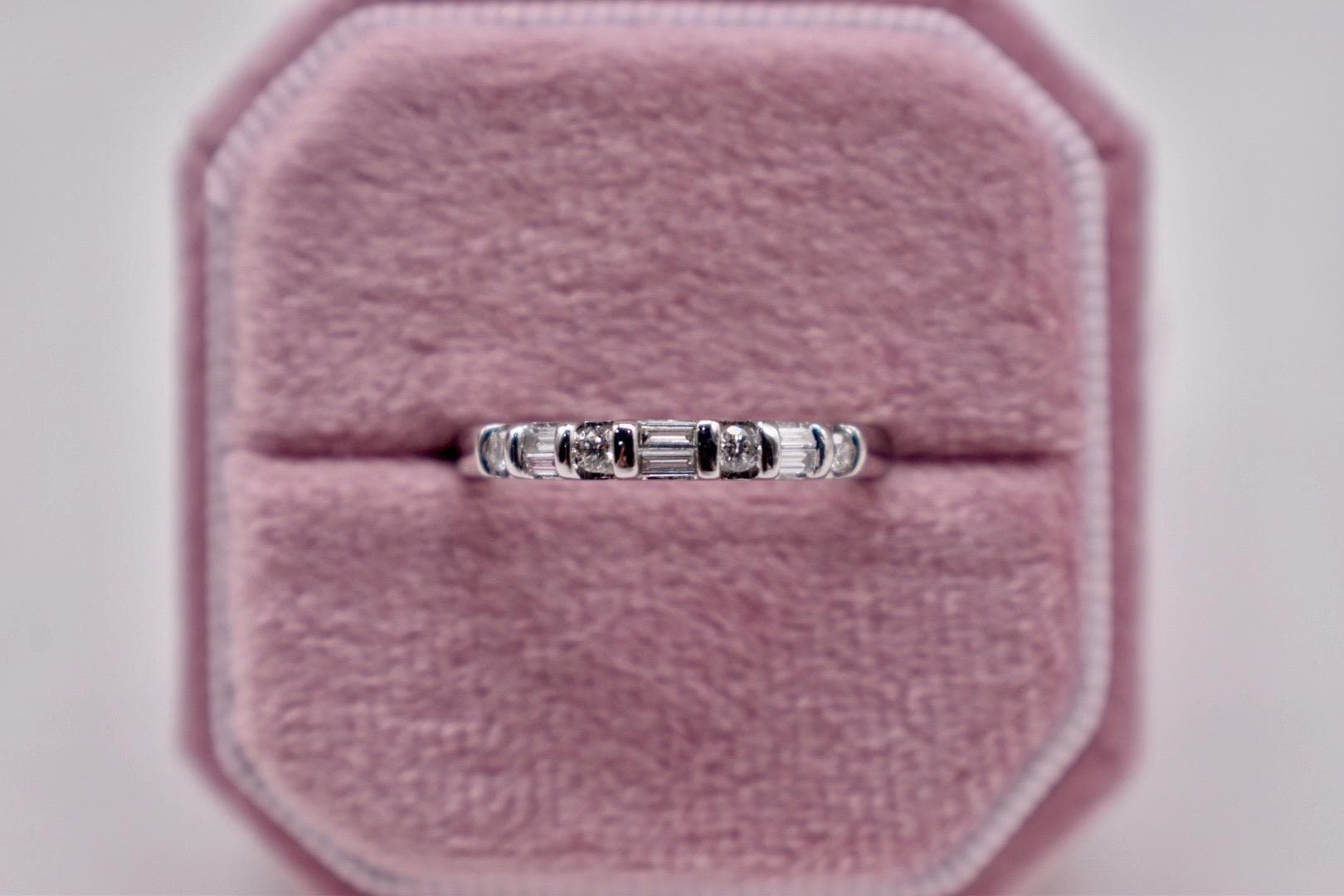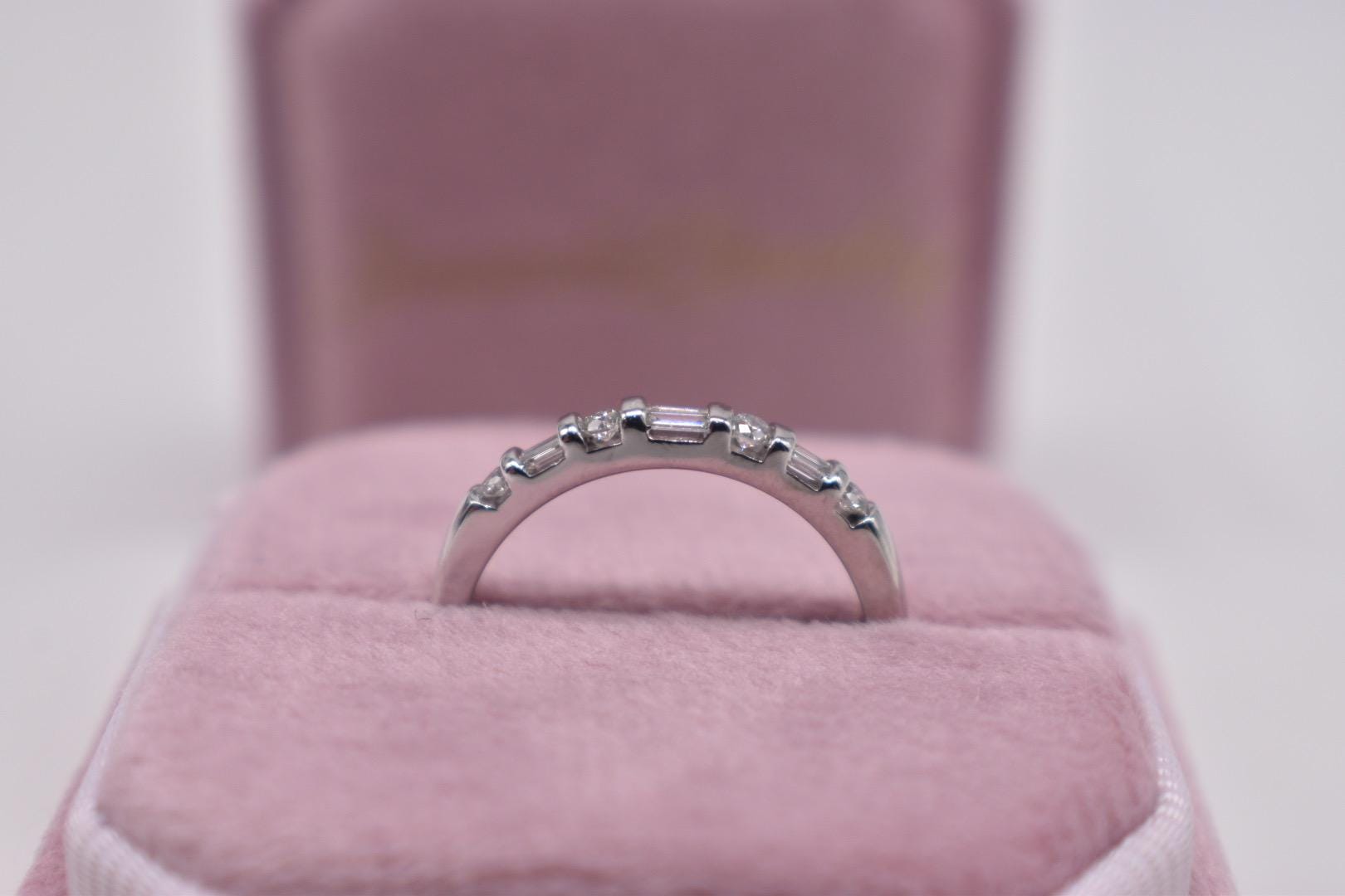 One 14 karat white gold unique vintage baguette and round bar channel diamond band. The ring is in outstanding condition very lightly worn. It is set with six straight baguette cut diamonds and four modern cut round diamonds all weighing approximately 0.50cts total weight featuring a color of G-H and a clarity of VS1-SI1. The ring weighs 2.3 grams and is a finger size 7. The shank of the ring is 2.75mm wide at the top and 1.69mm wide at the base. Appraisal Value: $1500. This ring will be shipped in a suede hand made vintage inspired ring box. These can be purchased separately from my store as well in an array of colors. This information is all 100% accurate and being sold by a GIA graduate gemologist. The ring can be sized or personalized with extra handling time and an extra fee. Please specify in notes at checkout if desired.