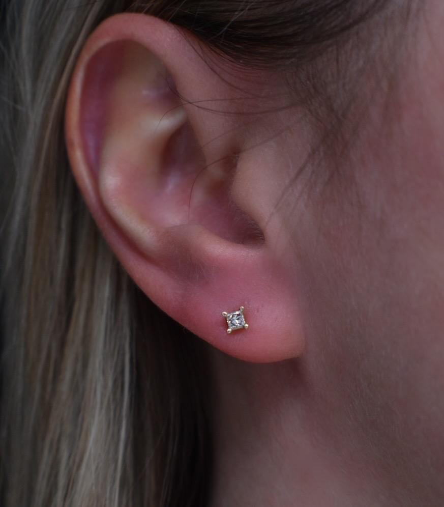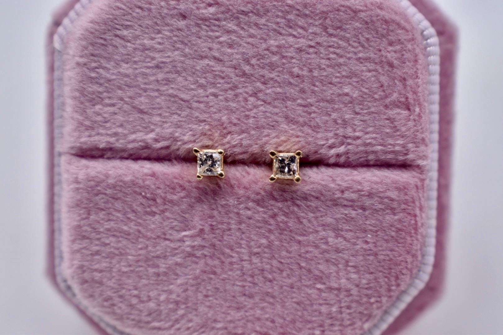 Beautiful 14K yellow gold princess cut diamond push back earrings. The earrings are set with two matching princess cut diamonds weighing approximately 0.20cts total weight featuring a color of I-J and a clarity of I1. The diamonds are set in 14K yellow gold four prong style mountings with a push back style post. The diamonds have been graded by a GIA diamond graduate and all information is 100% accurate. Earrings will come with a written insurance appraisal. Appraisal value: $400. Thanks!