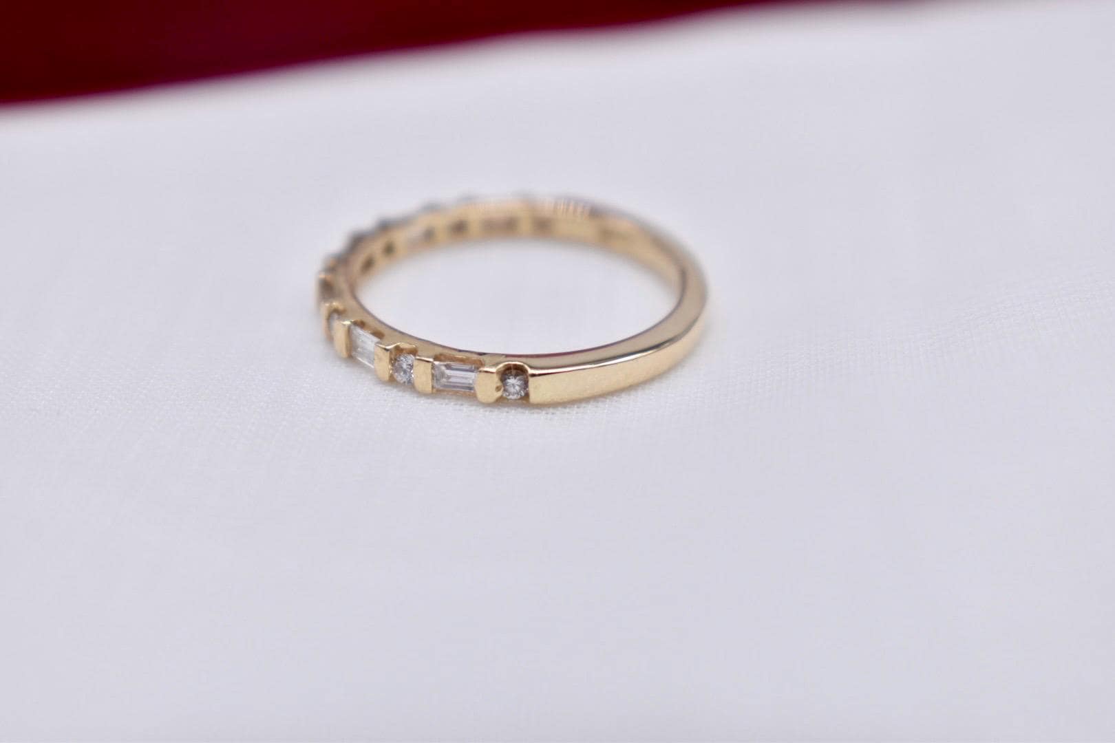 One 14K yellow gold beautiful baguette and round diamond unique wedding band. The ring is in excellent condition with little visible wear and a bar channel design. It is set with seven natural earth mined modern cut round diamonds weighing approximately 0.10cts total weight featuring a color of G-H and clarity of VS1-VS2. It is also set with six baguette diamonds weighing approximately 0.24cts total weight featuring a color of G-H and a clarity of VS1-VS2. The ring is a finger size 6.5 and it weighs 2.0 grams. The shank of the band at the bottom is 1.92mm and the band at its widest part on the top measures 2.25mm. Appraisal Value: $1800. This ring will be shipped in a vintage suede hand made ring box. These can be purchased separately from my store as well in an array of colors. This information is all 100% accurate and being sold by a GIA graduate gemologist. The ring can be sized or personalized with extra handling time and an extra fee. Please specify in notes at checkout if desired.