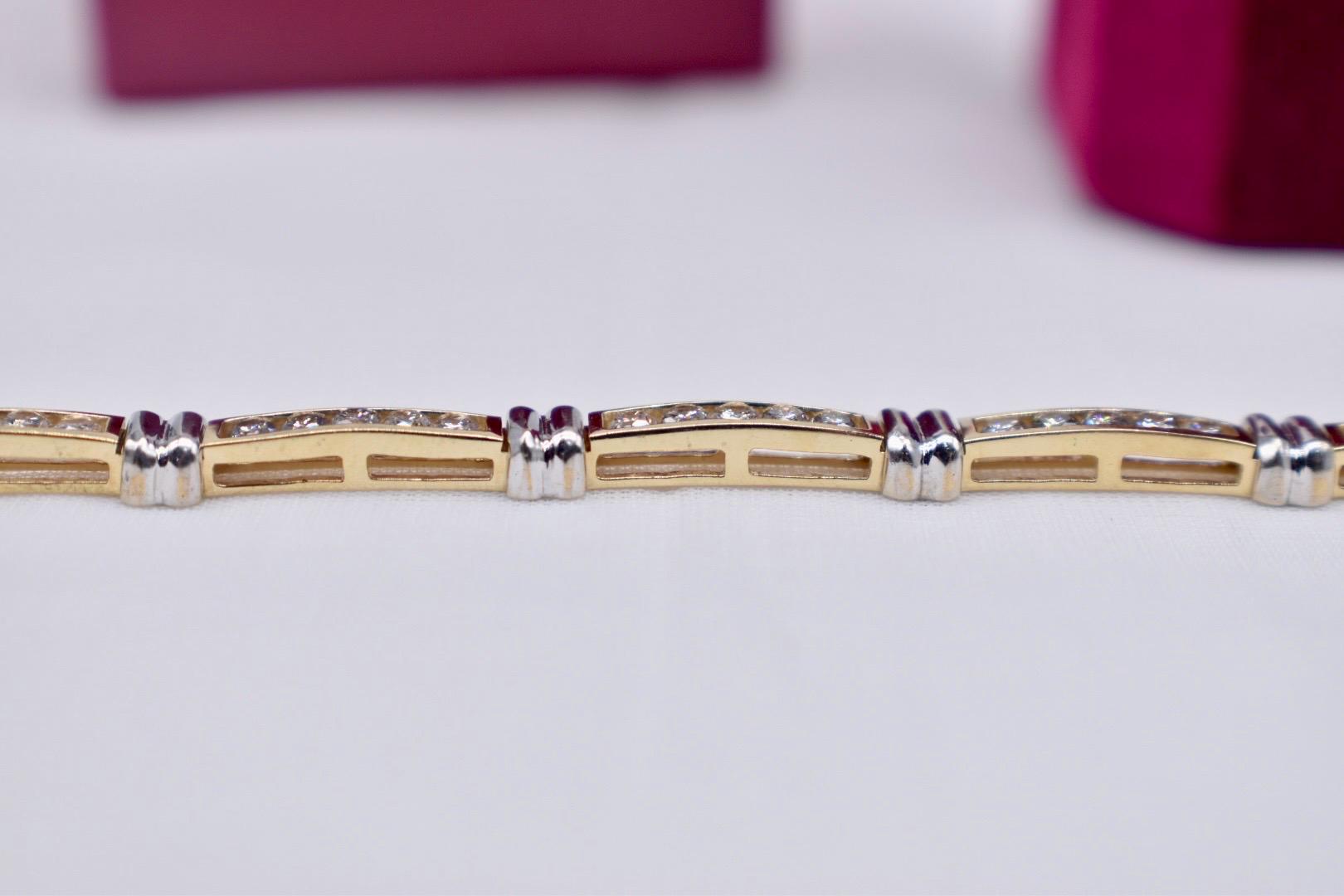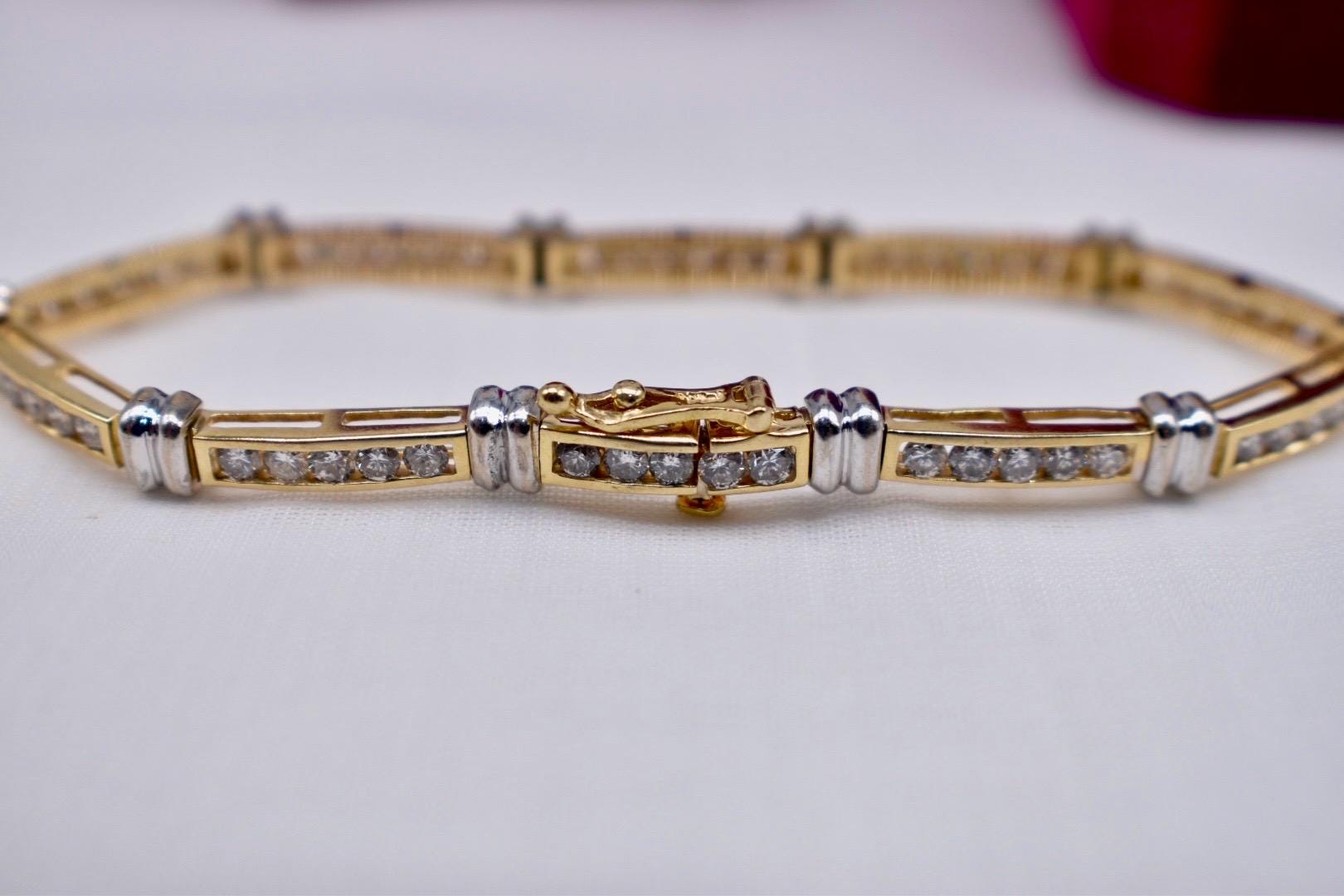 One 14K yellow and white gold vintage beautiful designed channel set diamond bracelet. The bracelet is in excellent condition with little visible wear. It is set with fifty matcing modern cut round diamonds weighing approximately 2.50cts total weight that are I-J in color and SI1-I1 in clarity. The bracelet weighs 12.0 grams and fits up to a 7 inch wrist and is 5.5mm wide with a tongue tab style clasp and a safety catch. The bracelet has a very unique hinged two toned design. Appraisal Value: $5000. This information is all 100% accurate and being sold by a GIA graduate gemologist.