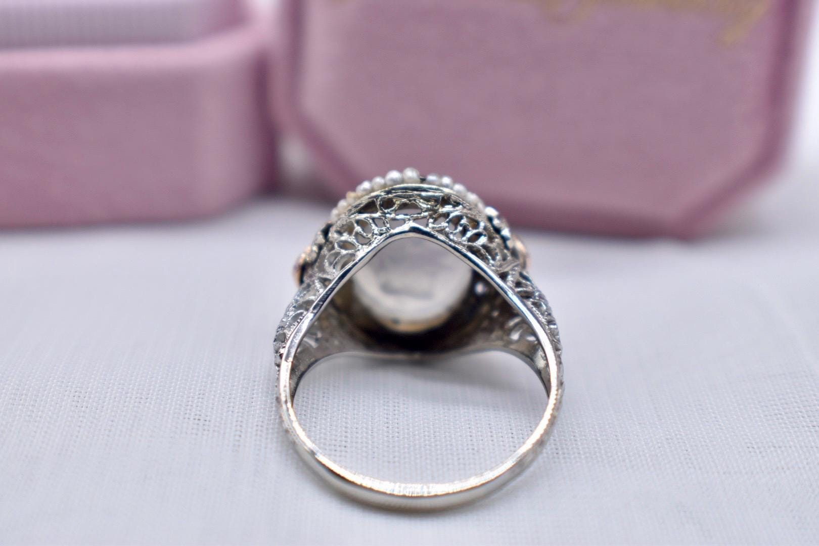 Vintage Art Deco 14K white and rose gold filagree sheen glass cameo and pearl halo style ring. The ring is in good antique condition with little visible wear and a gorgeous floral filigree art deco design. The ring is set with one oval carved glass cameo measuring approximately 14mm long by 10mm wide featuring a light bluish color with a metallic sheen when moved around. It is also set with twenty five little seed pearls around the cameo in a halo. The ring weighs 4.3 grams and is a finger size 7.75. The shank measures 4.88mm at the shoulders and 1.98mm at the bottom. The max width at the top of the ring is 17.07mm. Appraisal Value: $2500. This ring will be shipped in a vintage suede hand made ring box. This information is all 100% accurate and being sold by a GIA graduate gemologist. The ring can be sized or personalized with extra handling time and an extra fee. Please specify in notes at checkout if desired.