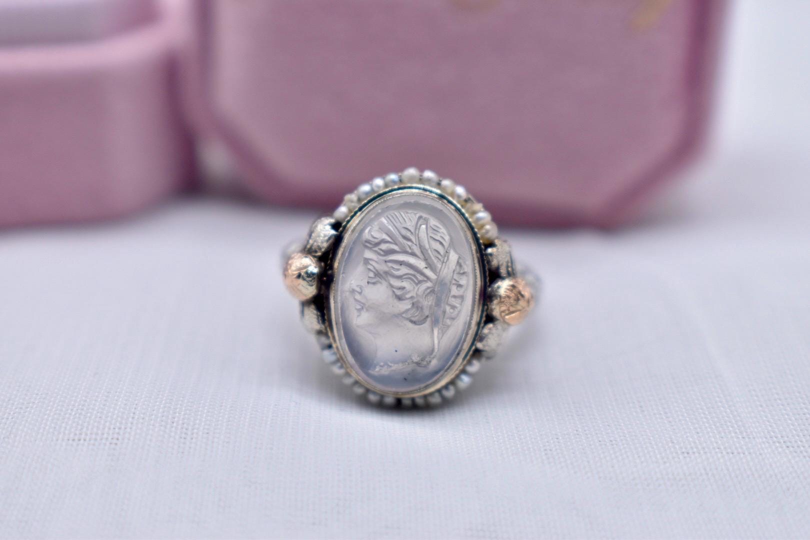 METAL / MATERIAL - 14K white gold with rose gold accents, glass carved cameo, natural seed pearls
