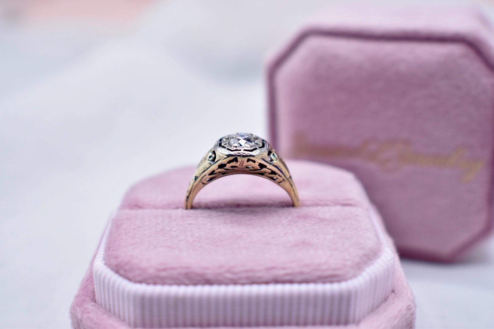 One Edwardian era 14K yellow gold & platinum old European cut diamond engagement ring from the 1910s. The ring is in very good condition with little wear and an intricate Edwardian filigree Octagon design. It is set with one primary old European cut diamond weighing approximately 0.40cts featuring a color of G and a clarity of VVS2. The ring weighs 2.10grams and is a finger size 6. The shank measures 3.77mm at the shoulders and 1.30mm at the base. The top of the ring measures 8.32mm. Appraisal Value: $2500. This ring will be shipped in a vintage suede hand made ring box. This information is all 100% accurate and being sold by a GIA graduate gemologist. The ring can be sized or personalized with extra handling time and an extra fee. Please specify in notes at checkout if desired.