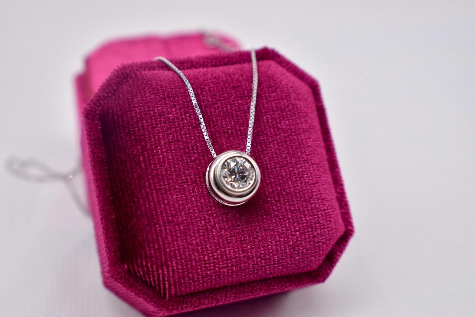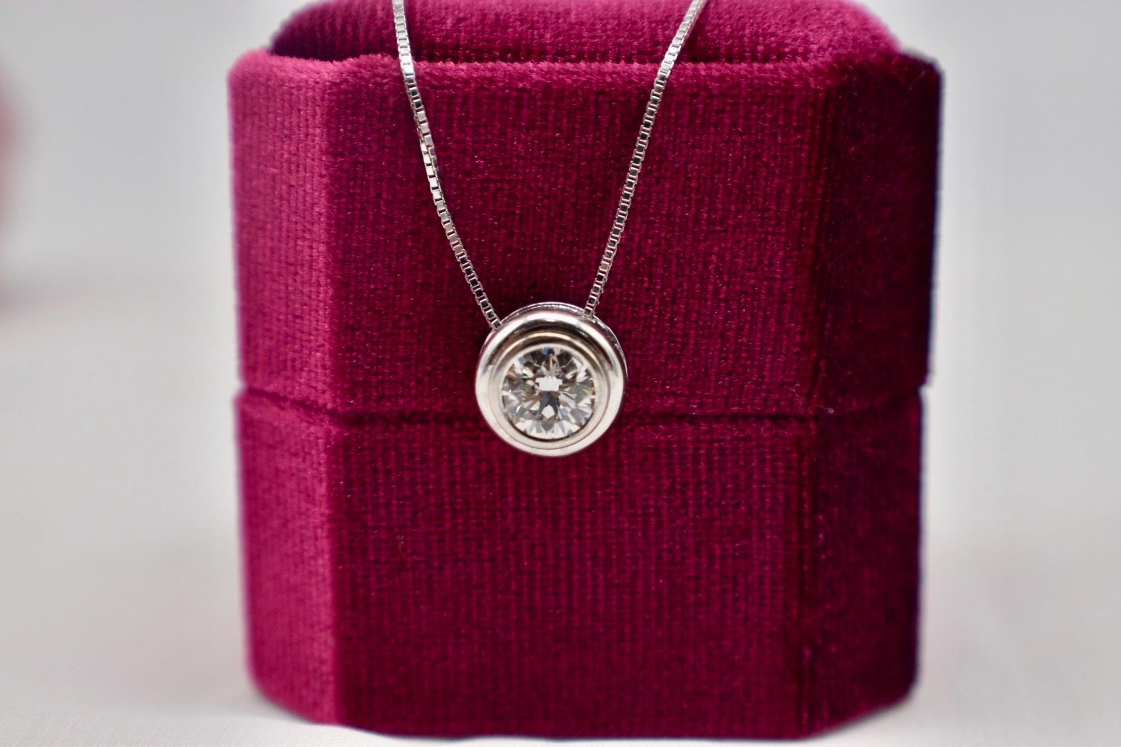 Beautiful 14K white Gold Estate round shape solitaire diamond bezel necklace. The necklace is set with an approximate 0.85cts center modern cut round natural earth mined diamond featuring a color of I and a clarity of VS1. The diamond is set in a 14k white gold bezel slide pendant that moves along a to a solid 18k white gold cable style chain that is 16 inches in length. The necklace weighs 3.8 grams. Appraisal Value: $5000. This information is all 100% accurate and being sold by a GIA graduate gemologist and will come with a written insurance appraisal that will be accepted by any insurance company. The chain can be shortened or lengthened for an extra or lessened charge and handling time please message for details. Please specify in notes at checkout if desired.