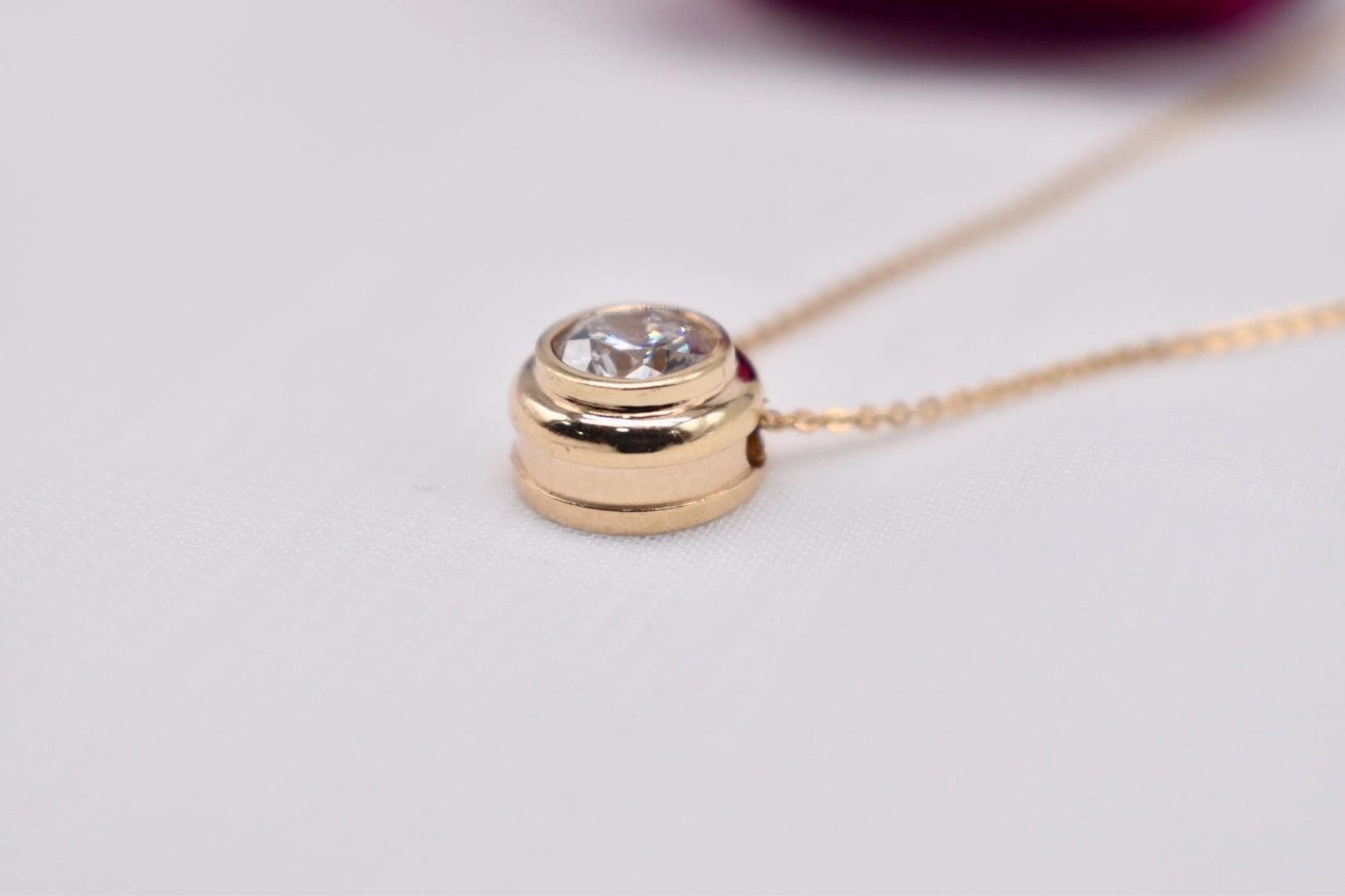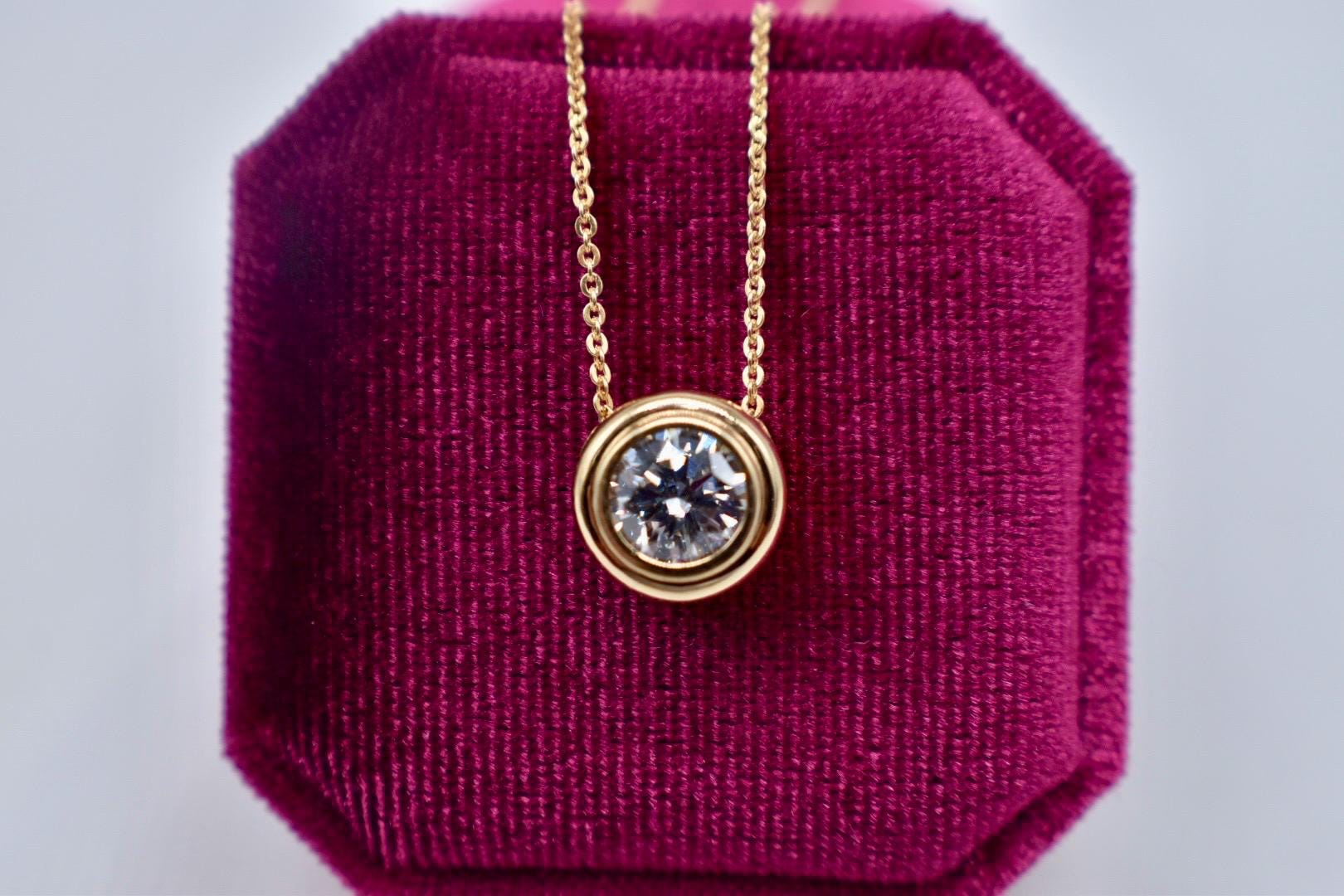 Beautiful 14K Yellow Gold Estate round shape solitaire diamond bezel necklace. The necklace is set with an approximate 1.50cts center modern cut round natural earth mined diamond featuring a color of H and a clarity of SI2. The diamond is set in a 14k yellow gold bezel slide pendant that moves along a to a solid 18k yellow gold cable style chain that is 20 inches in length. The necklace weighs 4.9 grams. Appraisal Value: $10,000. This information is all 100% accurate and being sold by a GIA graduate gemologist and will come with a written insurance appraisal that will be accepted by any insurance company. The chain can be shortened or lengthened for an extra or lessened charge and handling time please message for details. Please specify in notes at checkout if desired.