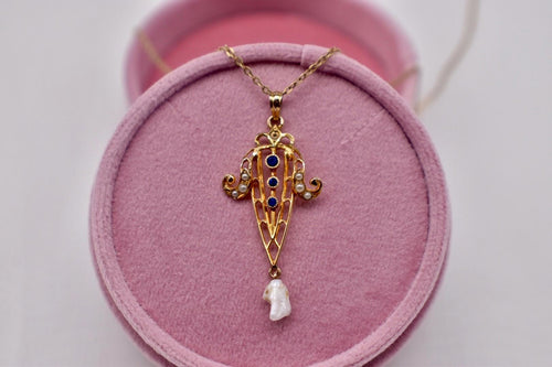 18K&10K Yellow Gold Victorian Seed Pearl and Sapphire Lavalier Necklace