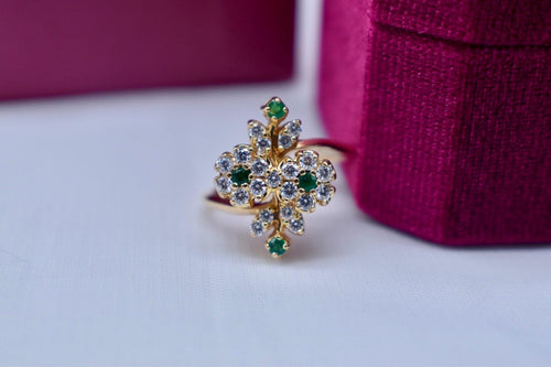 Vintage 18K Yellow Gold Emerald & Diamond Double Flower Ring