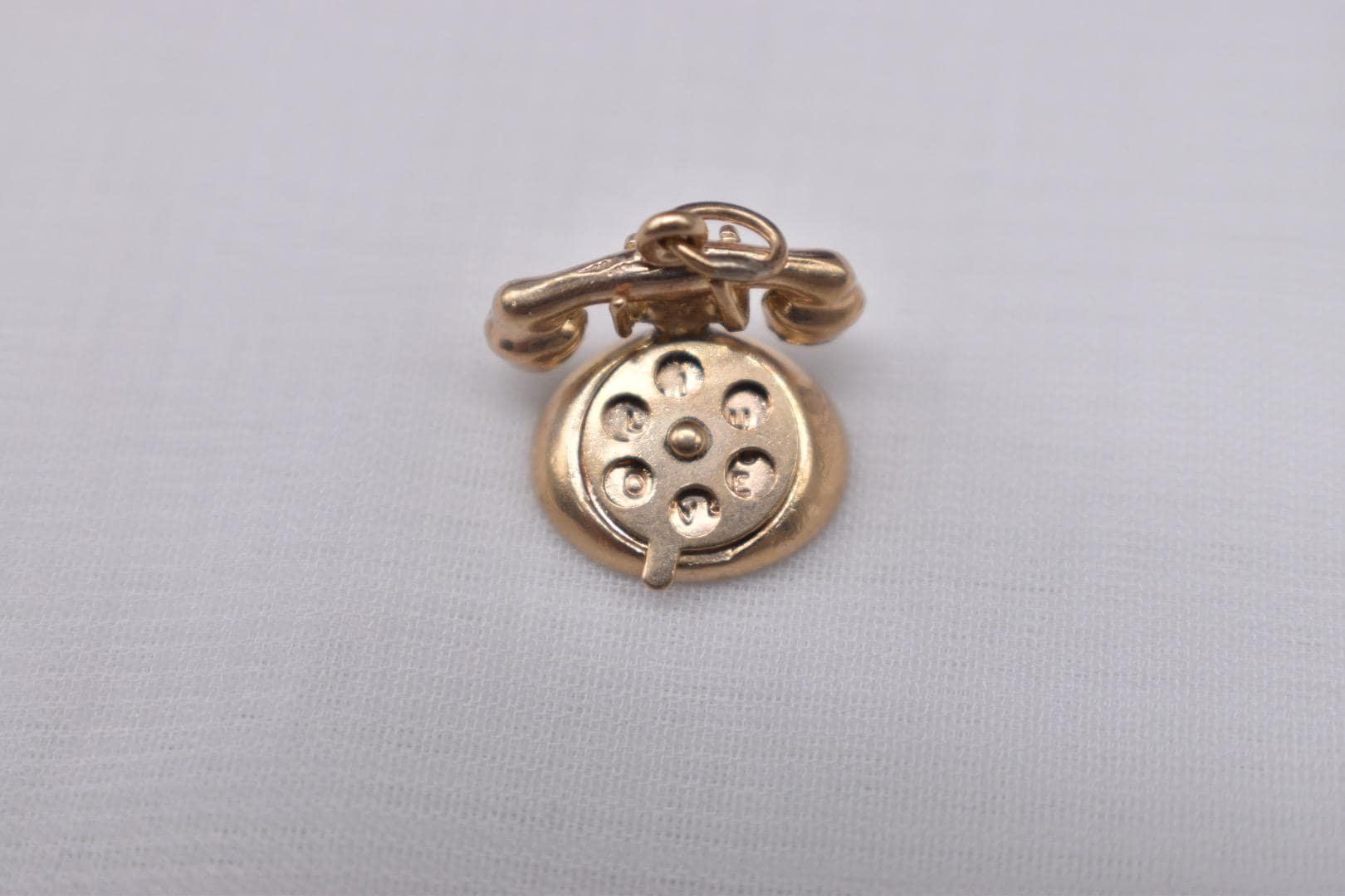 One 14k yellow gold vintage rotary phone Pendant or charm . The charm is in very good condition with light wear. The phone features a movable dial with a secret message (I LOVE U) underneath when moved one way and secret message (HELLO) when moved the other. The pendant measures 11.31mm tall and 15.35mm wide and weighs 2.3 grams. Appraisal value is $700. All information is 100% accurate from a GIA graduate.