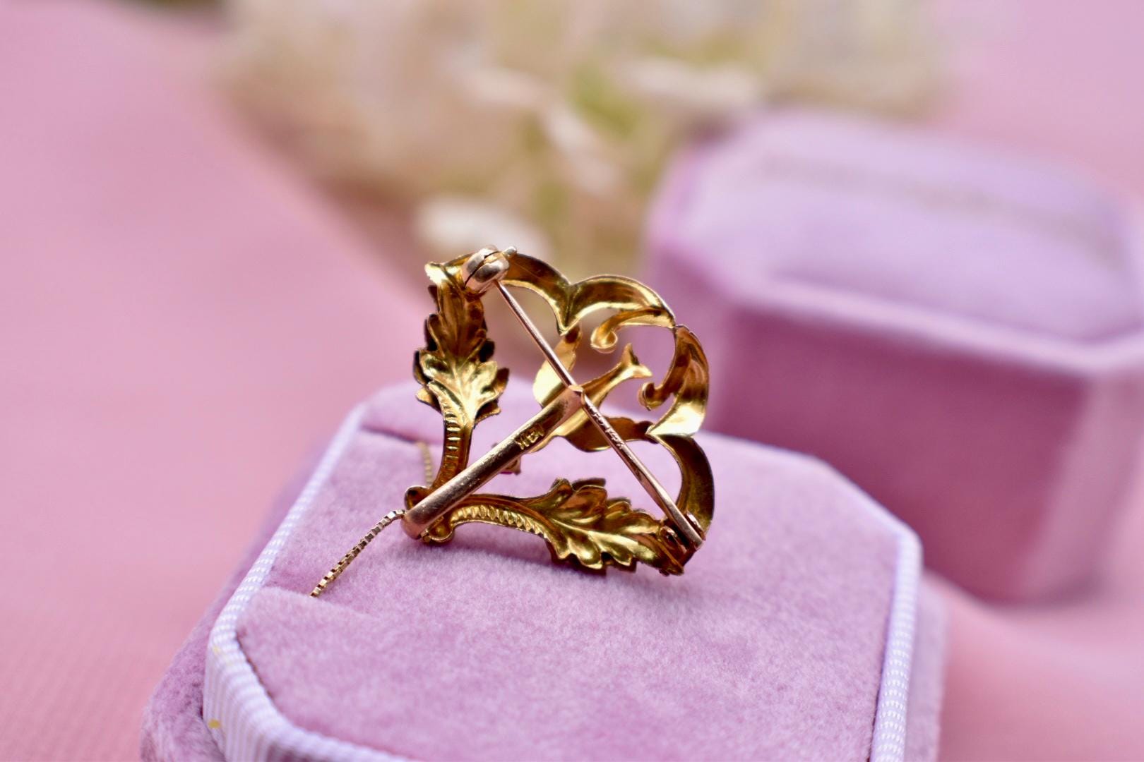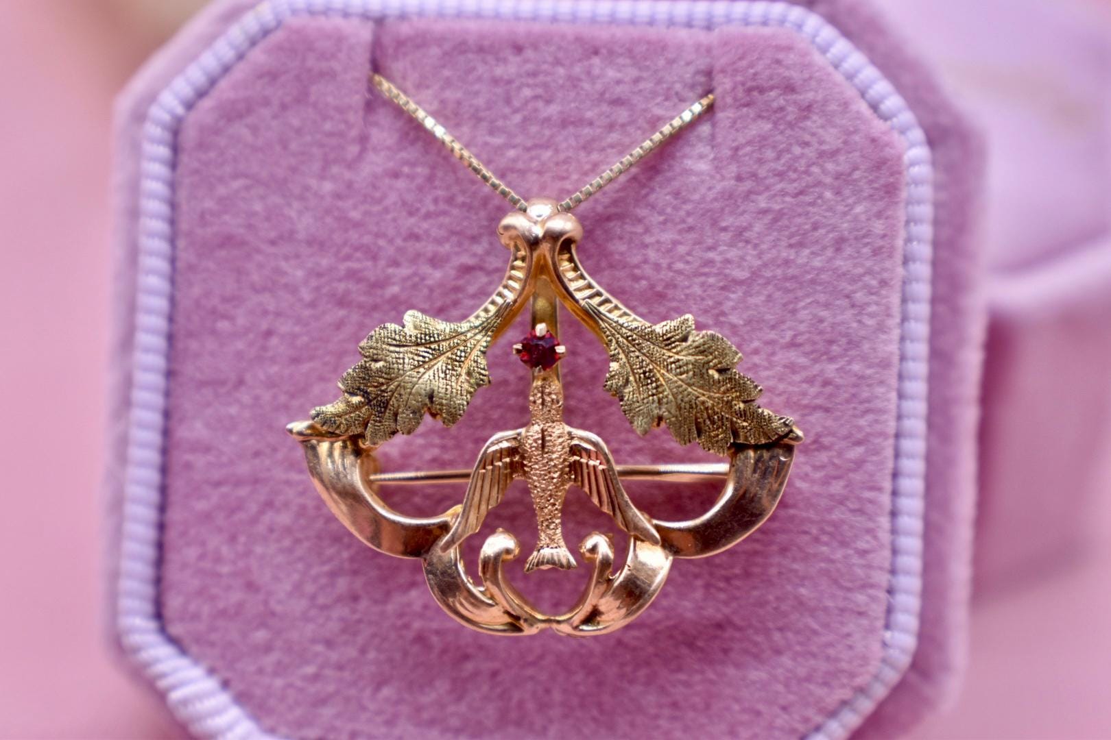 One 14 karat yellow gold art nouveau dove garnet brooch or necklace from the late 1800s- early 1900's. The pin/pendant is in great antique condition with little or no wear. The piece features an intricate art nouveau dove and leaf design and can be converted from a necklace easily to a brooch. It is set with one round garnet weighing approximately 0.05cts. The pendant part of the necklace measures 23.13mm in length and 27.50mm wide at its widest spot. It weighs 3.2 grams. The pendant slides along a dainty box style chain is 20.5" in length with a spring ring style clasp. Appraisal Value: $1200. This information is all 100% accurate and being sold by a GIA graduate gemologist. The pin will be sent in a vintage suede handmade pouch.