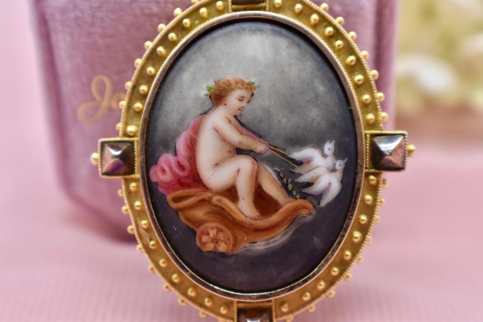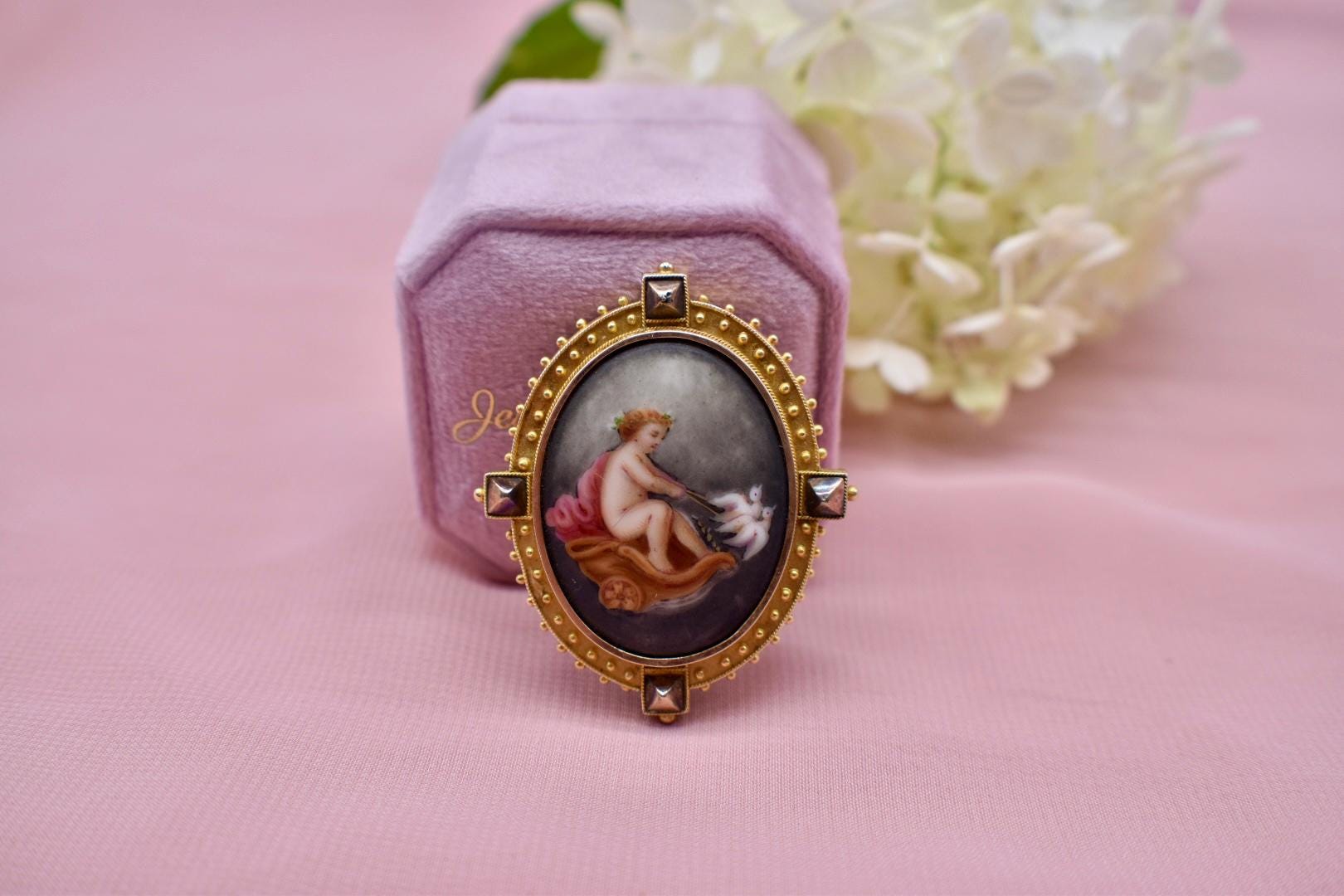 Victorian 16K yellow gold antique Victorian frame Hand Painted Cherub Brooch. Solid 16K with lock closure. The pin features a beautiful and unique hand painted porcelain piece. There is some natural antique wear and scratches that can be seen throughout as well as hand made evidence (See photos for detail). The brooch measures 2inches in length and 1.6 inches in width and weighs 11.6 grams. It is in excellent preowned condition with little to no noticeable wear. Appraisal value is $2500.