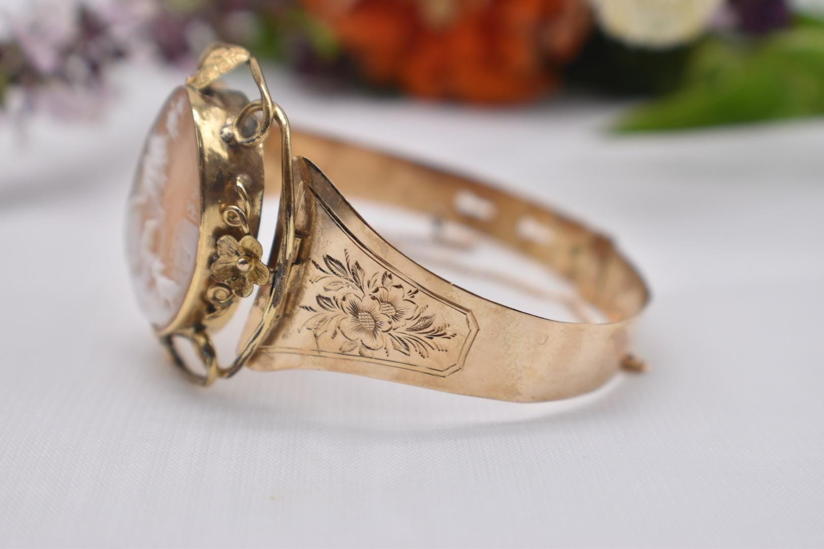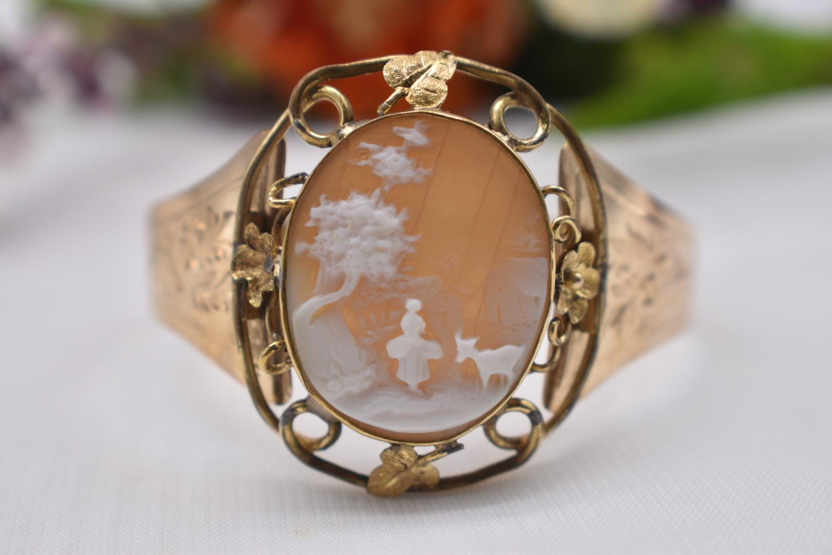 One solid 12 karat gold antique Victorian cameo bracelet from 1800s. The bracelet is in antique condition with some light noticeable wear throughout (See photos for detail). The adjustable clasp and closure work like new. The bracelet features one oval shape genuine shell cameo with a popular intricate countryside scene called Rebecca at the Well measuring 1 inch by 0.75 inches. The face of the bracelet measures 1.4inches wide and the band of the bracelet tapers from 23mm to 8mm wide at the base with a safety chain attached. The bracelet is adjustable in size and can fit up to a 7.25 inch wrist. The bracelet weighs 10.4 grams. The bracelet features a beautiful Victorian floral design throughout. Appraisal Value: $2000. This pin will be shipped in a vintage suede hand made box.