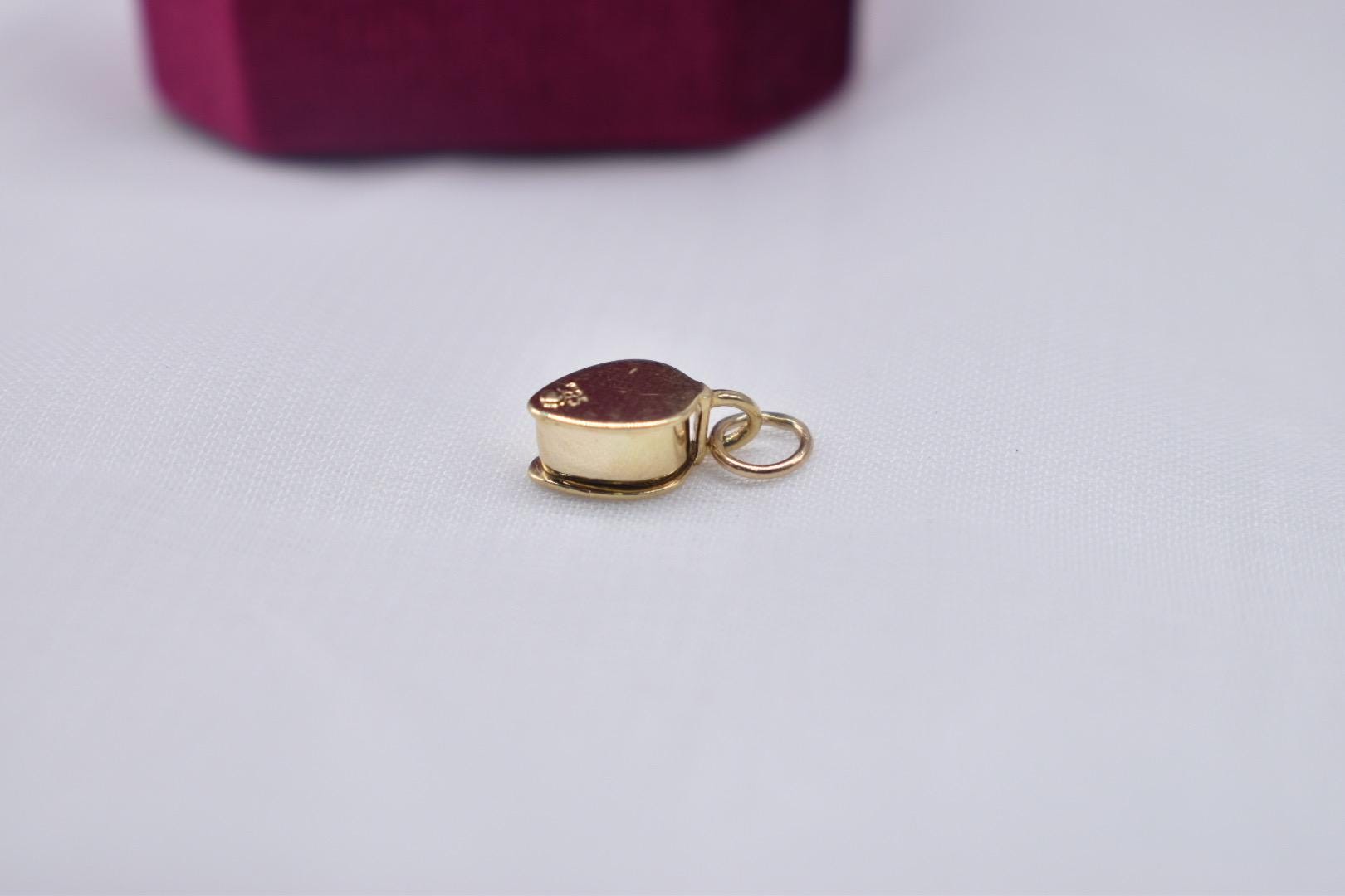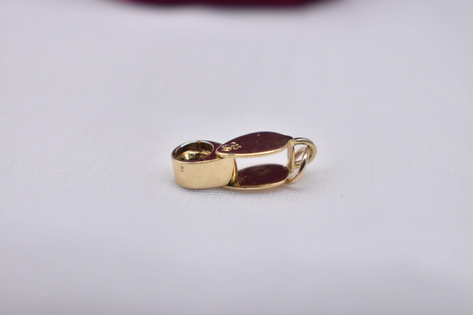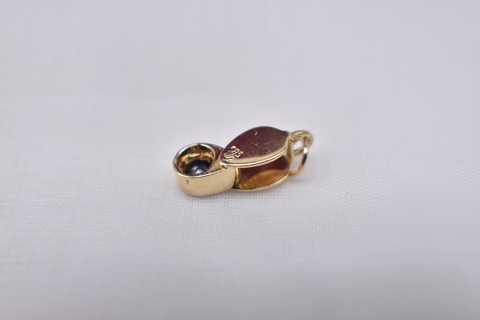 One 14k yellow gold rare vintage jewelers loupe pendant or charm. The charm is in good antique condition with light wear with a animated design (See photos for analysis of detail). It features one diamond cut round AA quality blue sapphire as the viewing glass weighing approximately 0.12cts with a deep blue color. The charm measures 17.80mm tall and 6.09mm wide not including the jump ring when folded out and weighs 1.7 grams. Appraisal value is $1000. All information is 100% accurate from a GIA graduate.