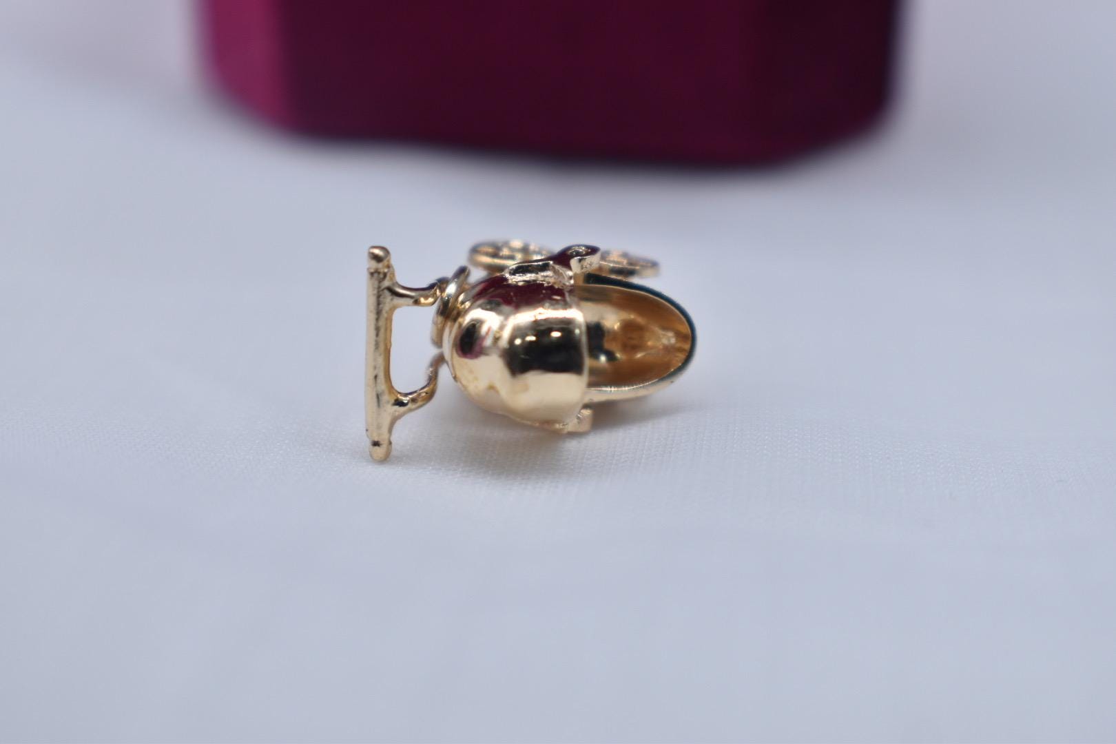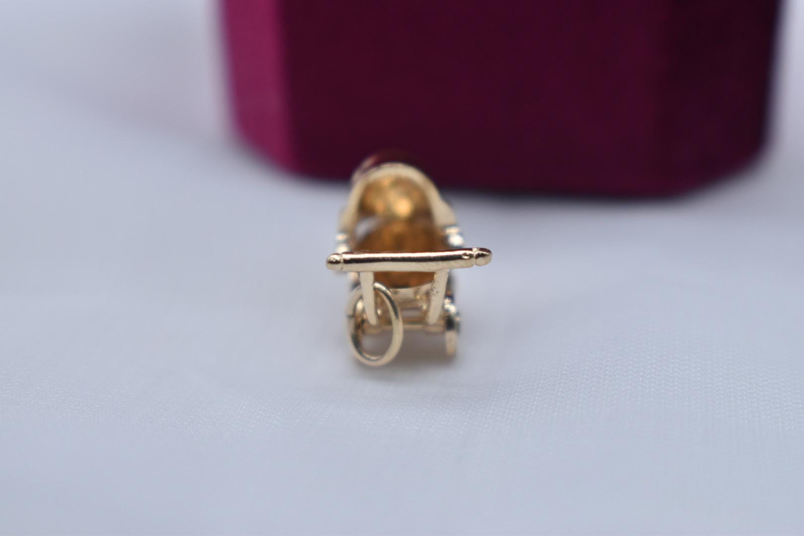 One 14k yellow gold vintage animated baby carriage pendant or charm. The charm is in good antique condition with light wear with a animated mechanical design (See photos for analysis of detail). The wheels and baby carriage top move. The charm measures 12.85mm tall and 16.65mm wide not including the jump ring and weighs 2.6 grams. Appraisal value is $700. All information is 100% accurate from a GIA graduate.