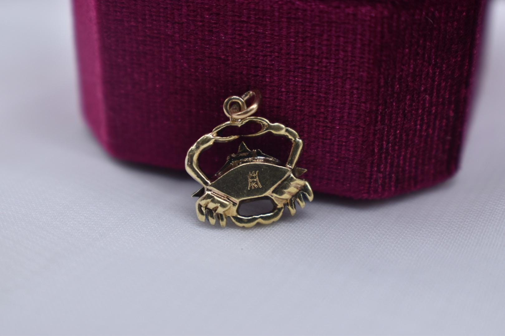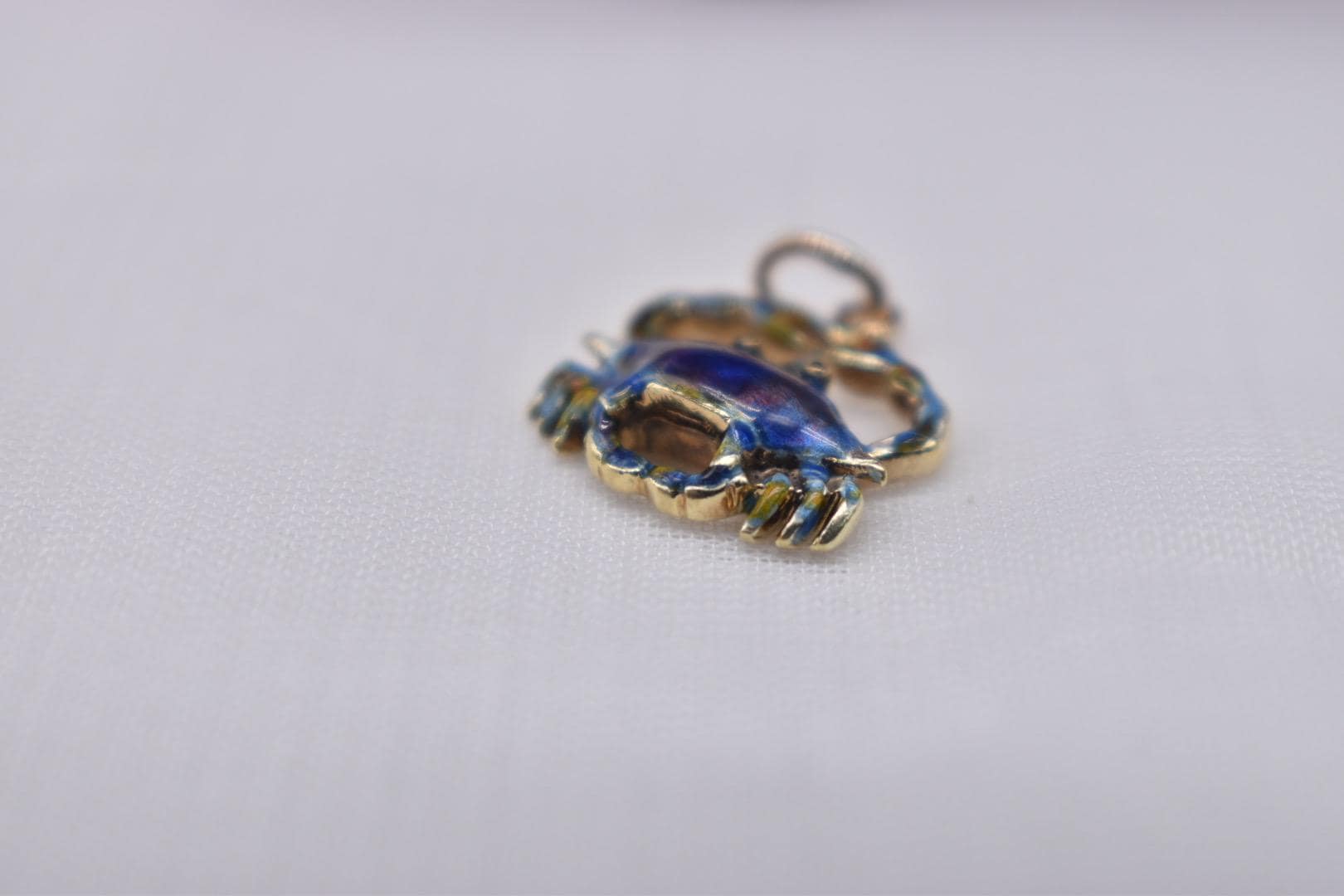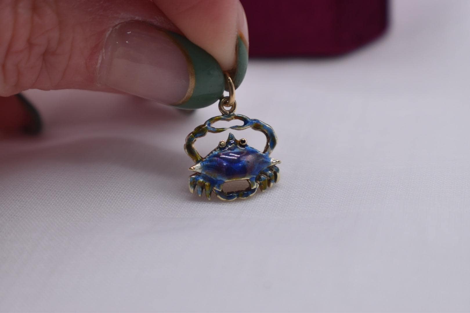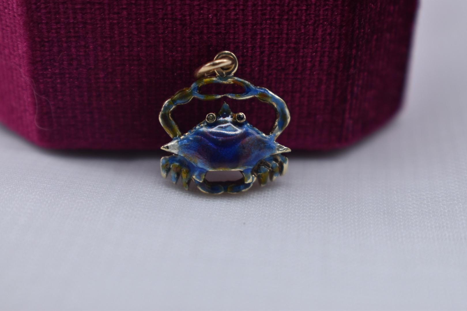 One 14k yellow gold vintage blue crab pendant or charm. The charm is in good antique condition with light wear and beautiful blue and brownish green enamel (See photos for analysis of detail). The charm measures 14.82mm tall and 13.44mm wide not including the jump ring and weighs 2.2 grams. Appraisal value is $800. All information is 100% accurate from a GIA graduate.
