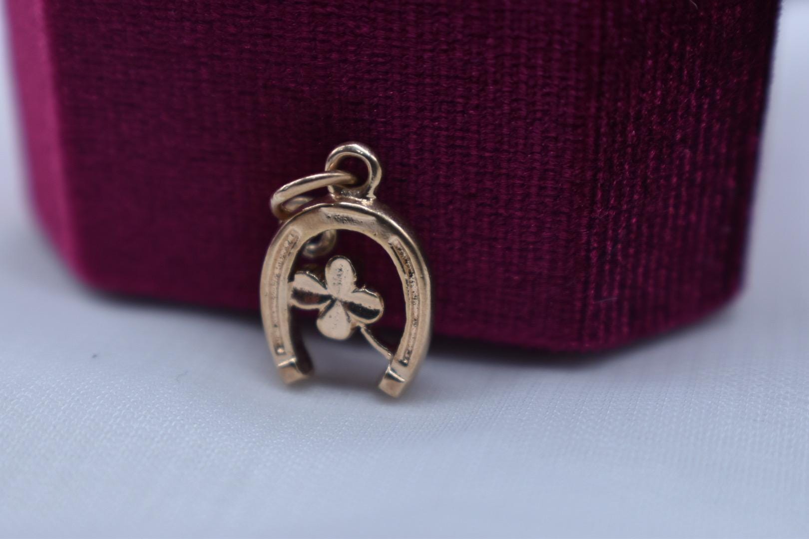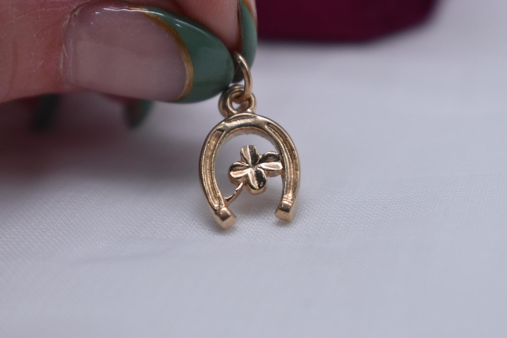 One 14k yellow gold vintage horseshoe four leaf clover pendant or charm. The charm is in good antique condition with light wear (See photos for analysis of detail). The charm measures 15.35mm tall and 10.20mm wide not including the jump ring and weighs 1.8 grams. Appraisal value is $650. All information is 100% accurate from a GIA graduate.