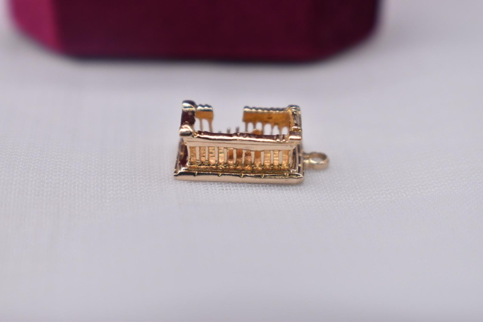 One 14k yellow gold vintage Athens, Greece Acropolis pendant or charm. The charm is in good antique condition with light wear (See photos for analysis of detail). The charm measures 15.63mm long, 5.97mm tall and 6.35mm wide not including the jump ring and weighs 1.6 grams. Appraisal value is $800. All information is 100% accurate from a GIA graduate.